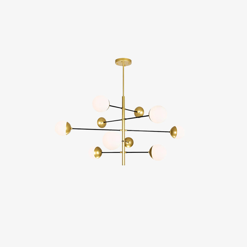 10-Globe Modern Brass Chandelier chandelier features a sleek brass finish for a luxurious yet understated look. The globe shade is split into two parts, with one half covered in opaque brass and the other allowing soft, diffused light to filter through, creating a balanced lighting effect. The lamp's clean lines and geometric symmetry make it perfect for contemporary interiors, dining rooms or living spaces looking to incorporate a sleek, modern twist.