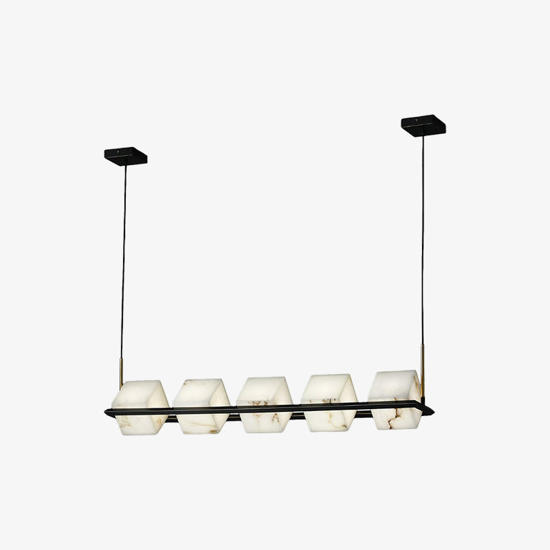 Introducing our Alabaster Cubic Island Chandelier! This stunning piece features polished alabaster square shades and a matte black bracket for a touch of elegance. With a variety of available shapes, it is versatile enough to complement any space. Elevate your home decor today!