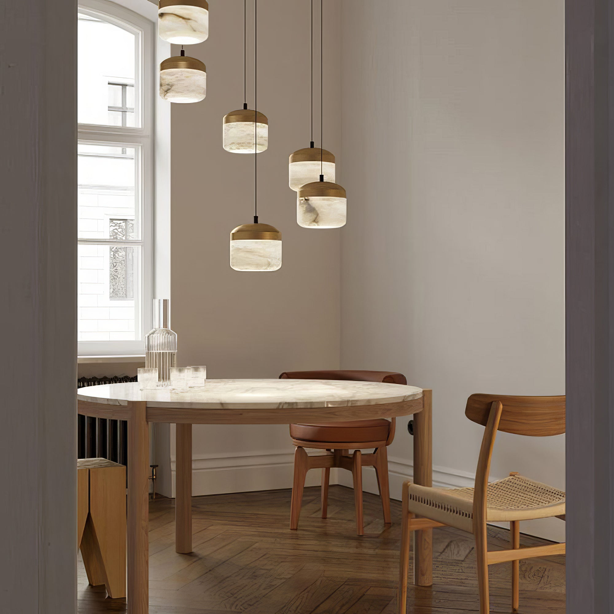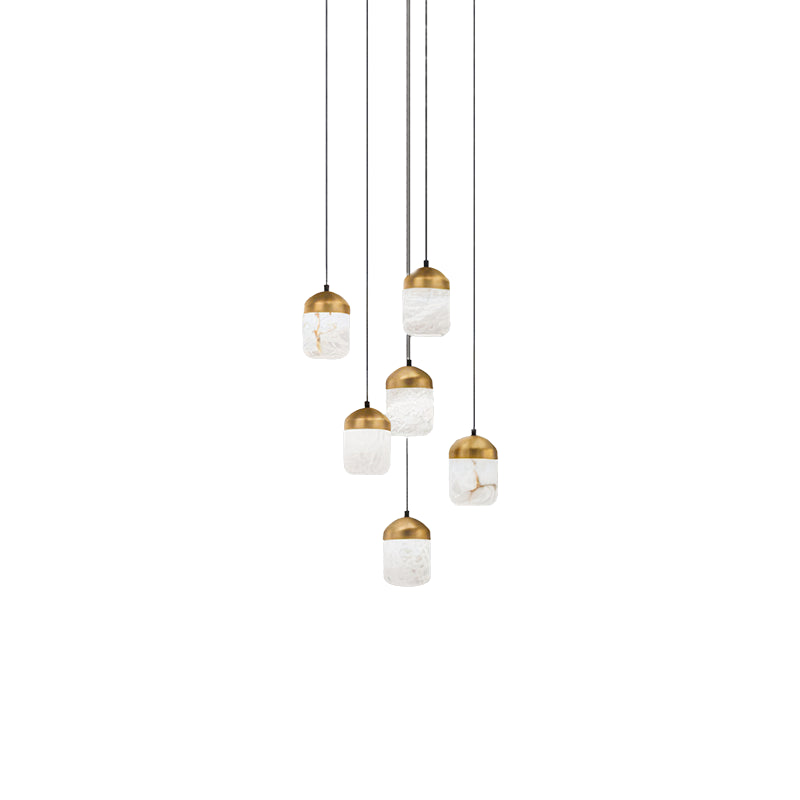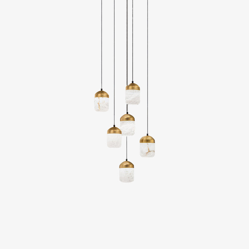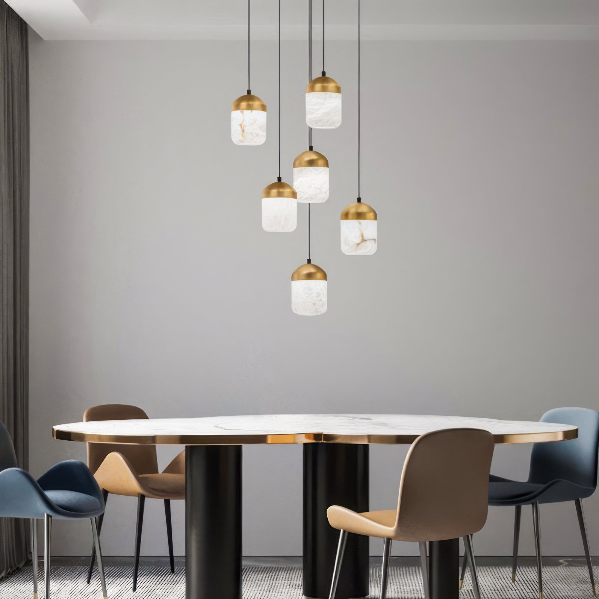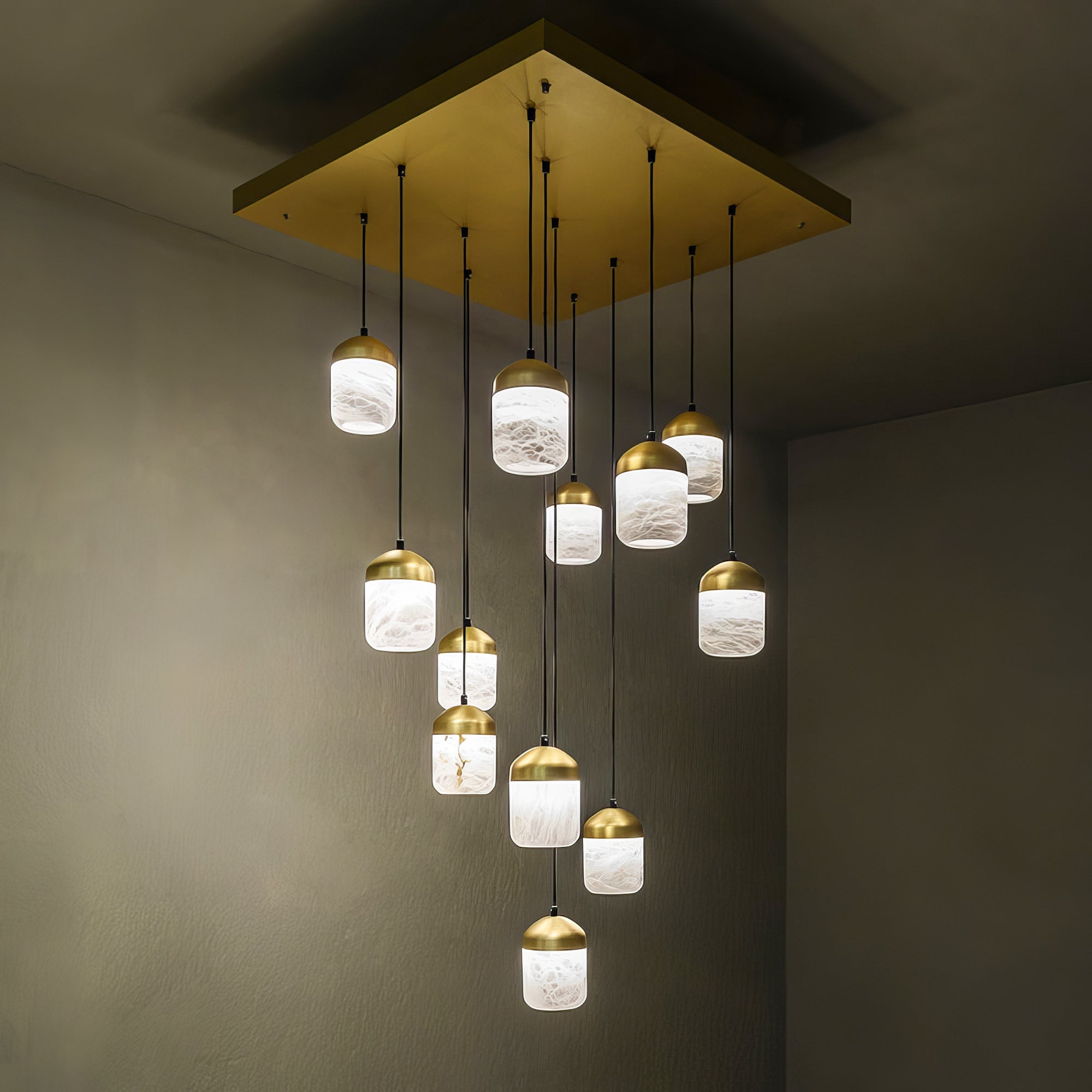 Elevate your space with our modern and stylish Alabaster staircase chandelier. Its sleek design and warm, natural lighting will enhance any room while adding a touch of contemporary elegance. Transform your home with this uniquely appealing and functional piece!