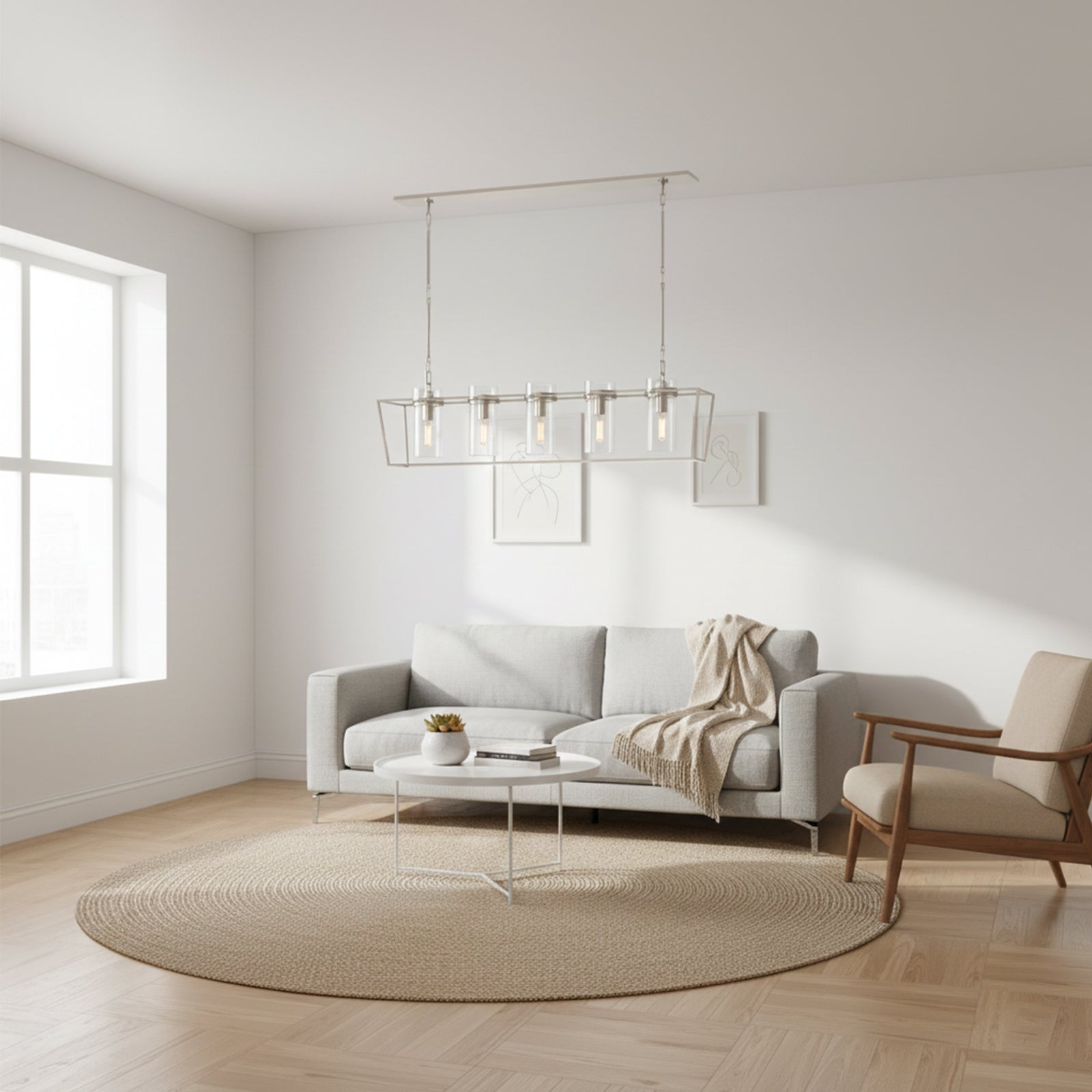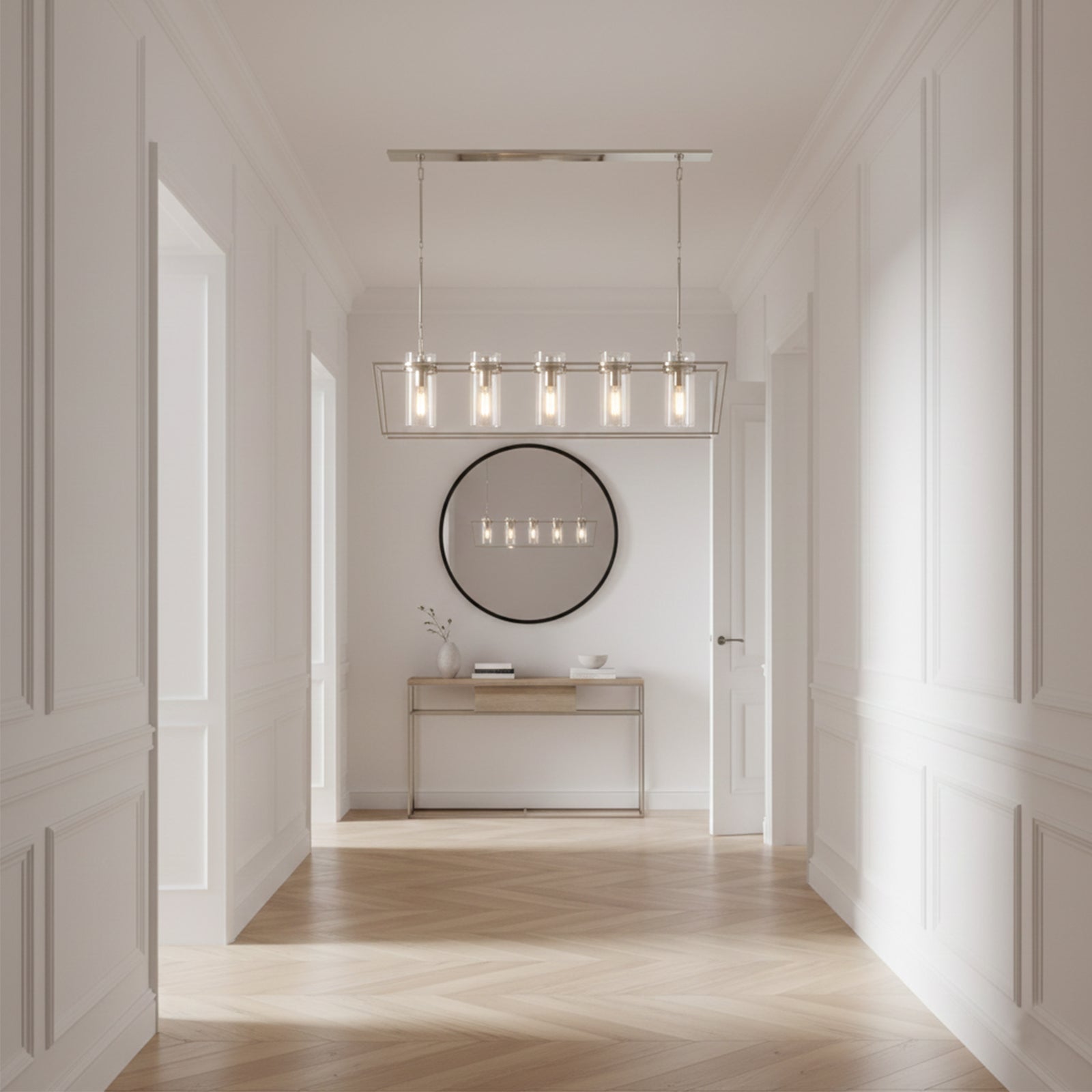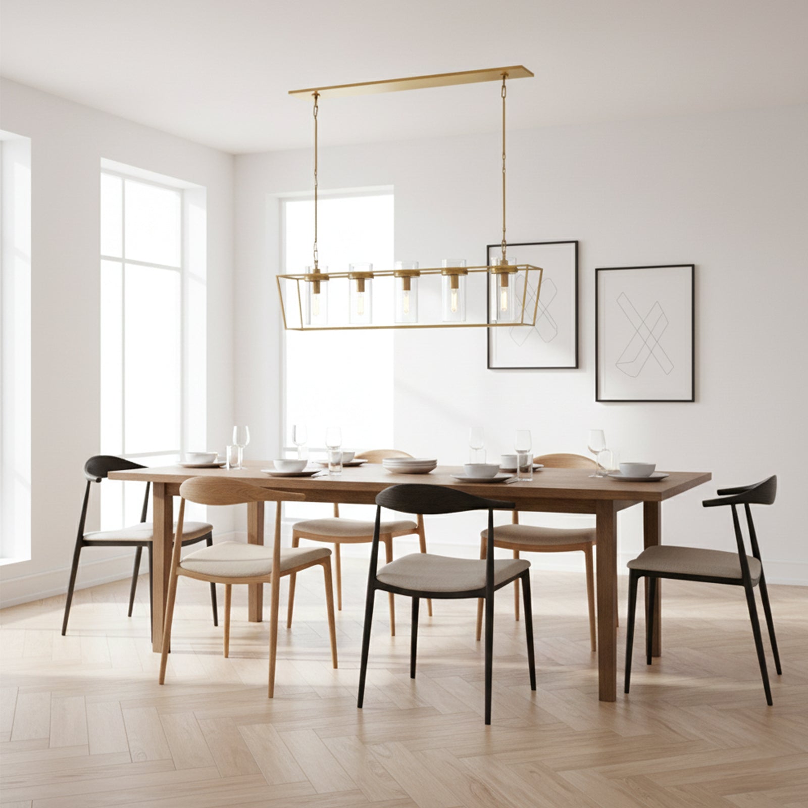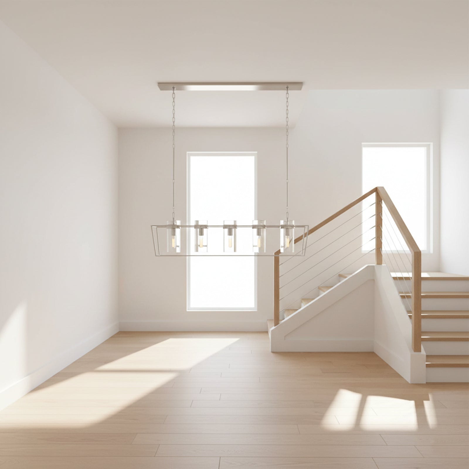 Enhance your space with the Linear Glass Cylinder Chandelier! Crafted with a sturdy metal band and elegant glass components, this chandelier adds both brightness and sophistication to any interior. The arrangement of five glass cylinders creates a beautiful, refined effect, suspended from central and connecting rods. This striking linear design is perfect for illuminating dining tables or large living areas, instantly elevating the space.