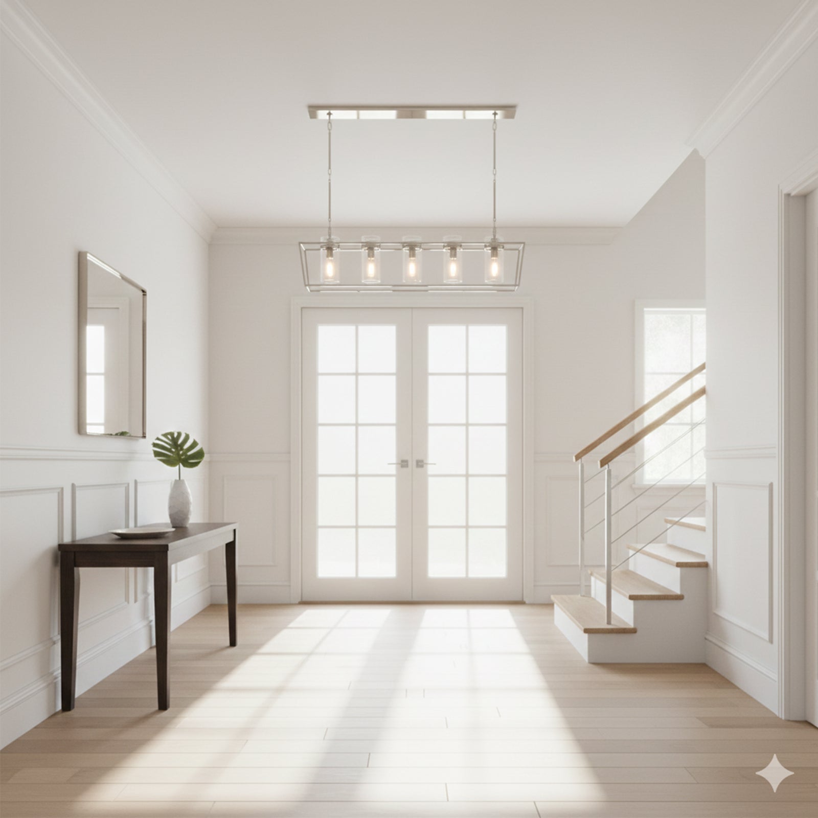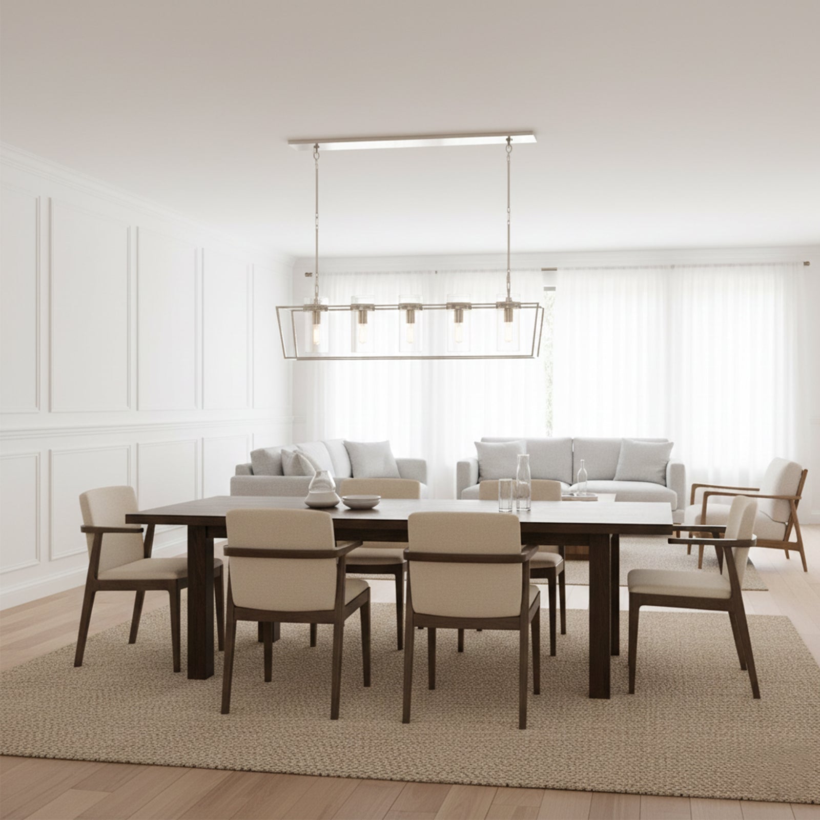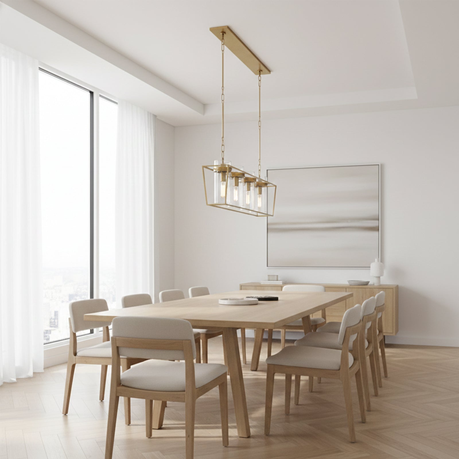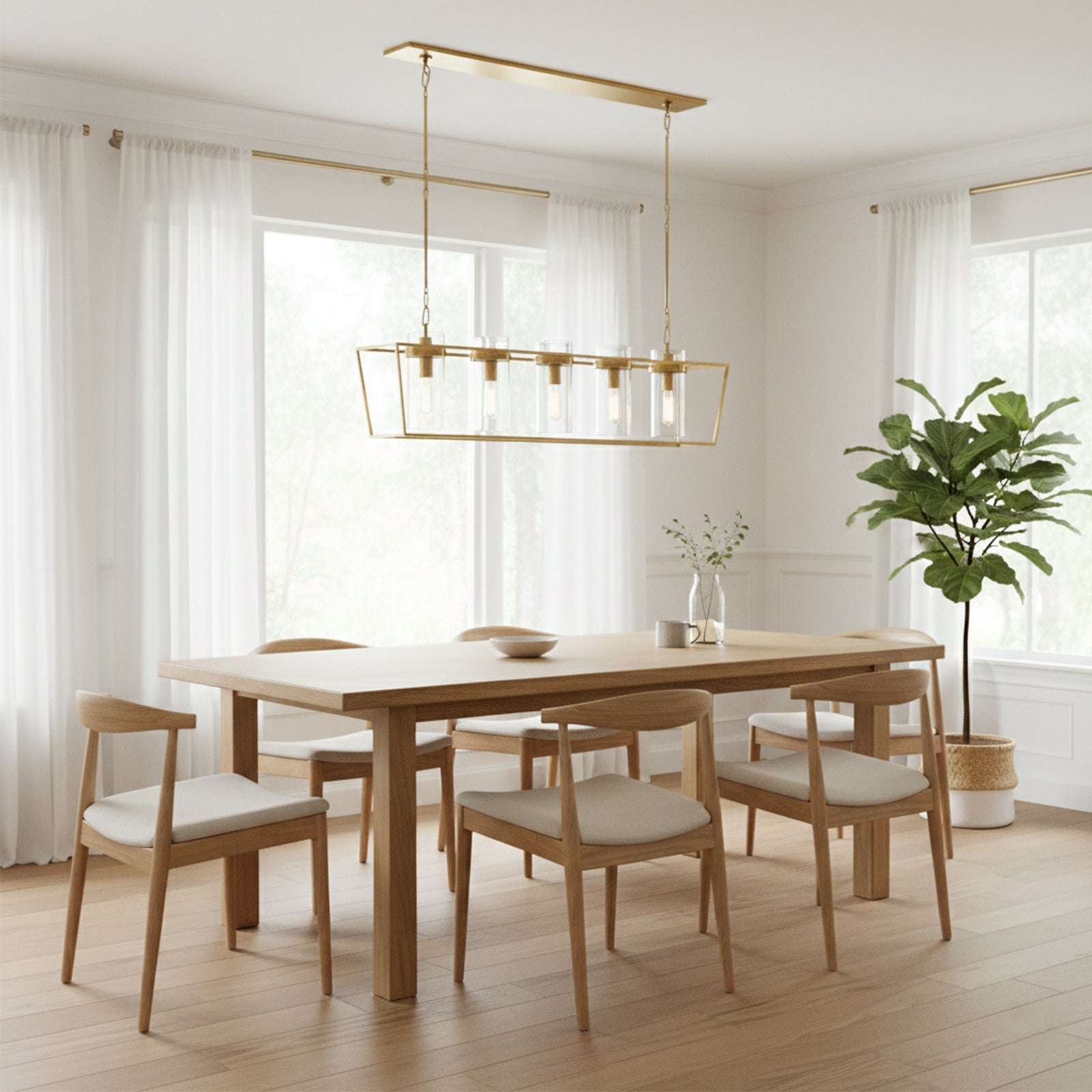 Enhance your space with the Linear Glass Cylinder Chandelier! Crafted with a sturdy metal band and elegant glass components, this chandelier adds both brightness and sophistication to any interior. The arrangement of five glass cylinders creates a beautiful, refined effect, suspended from central and connecting rods. This striking linear design is perfect for illuminating dining tables or large living areas, instantly elevating the space.