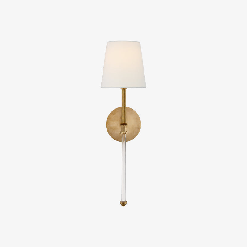 Upgrade your home decor with the Camille Wall Sconce. This modern and stylish lamp features a unique design with a tapered shade and rounded wall plate, creating a balanced and striking look. Add a touch of elegance to any room with this must-have piece.
