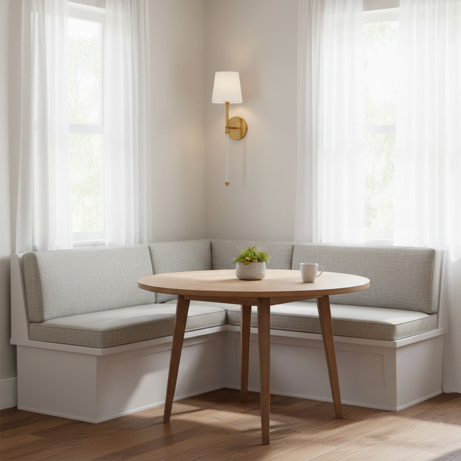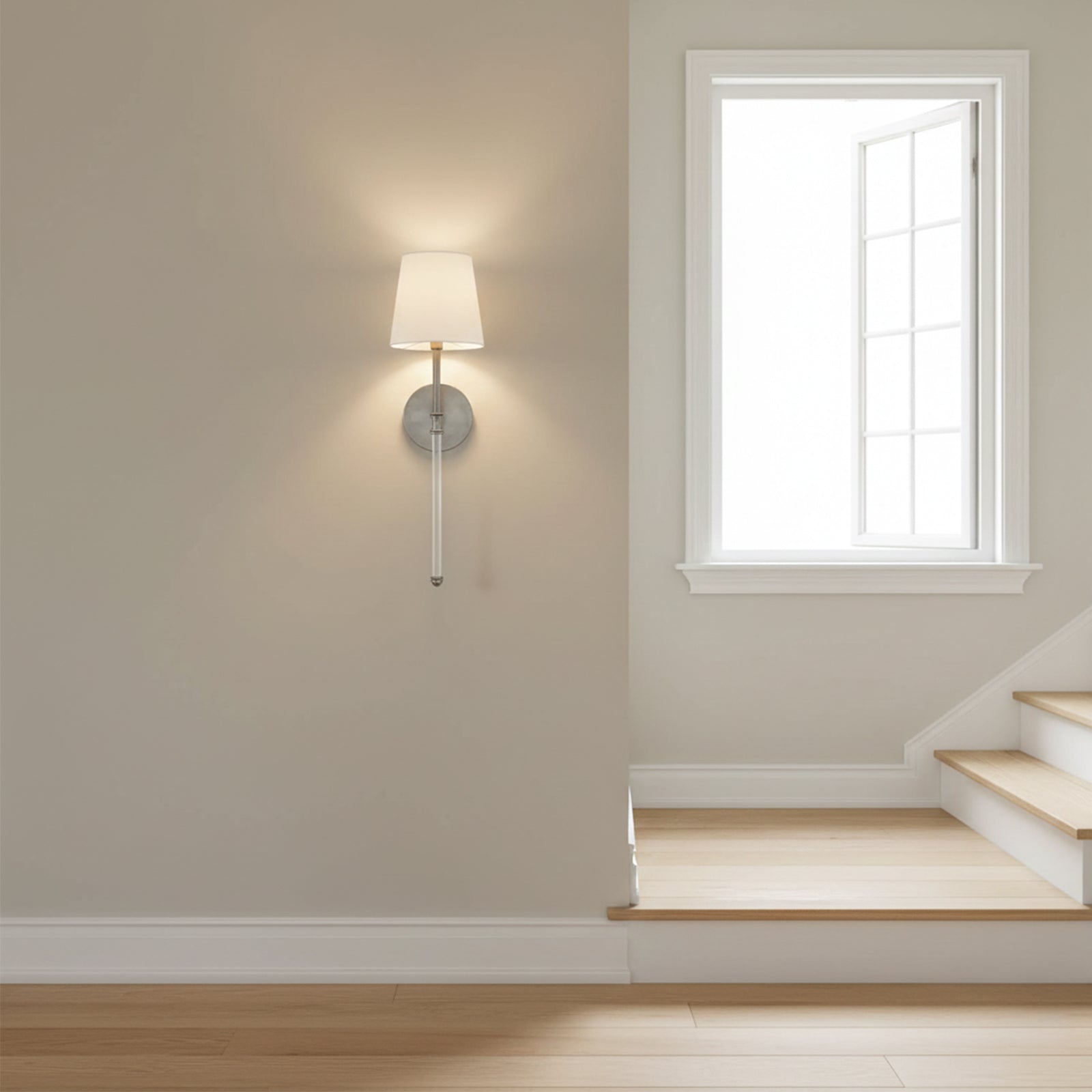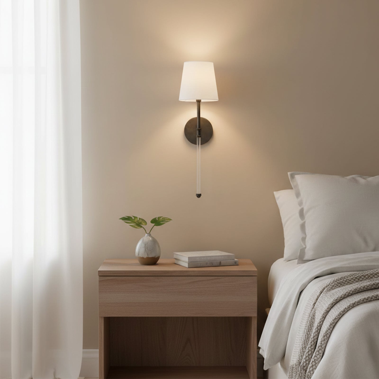 Upgrade your home decor with the Modern Fabric Shade Wall Light. This modern and stylish lamp features a unique design with a tapered shade and a rounded wall plate, creating a balanced and striking look. The fabric shade ensures a soft, warm glow that enhances the ambiance. Add a touch of elegance to any room with this must-have piece, perfect for a contemporary aesthetic.