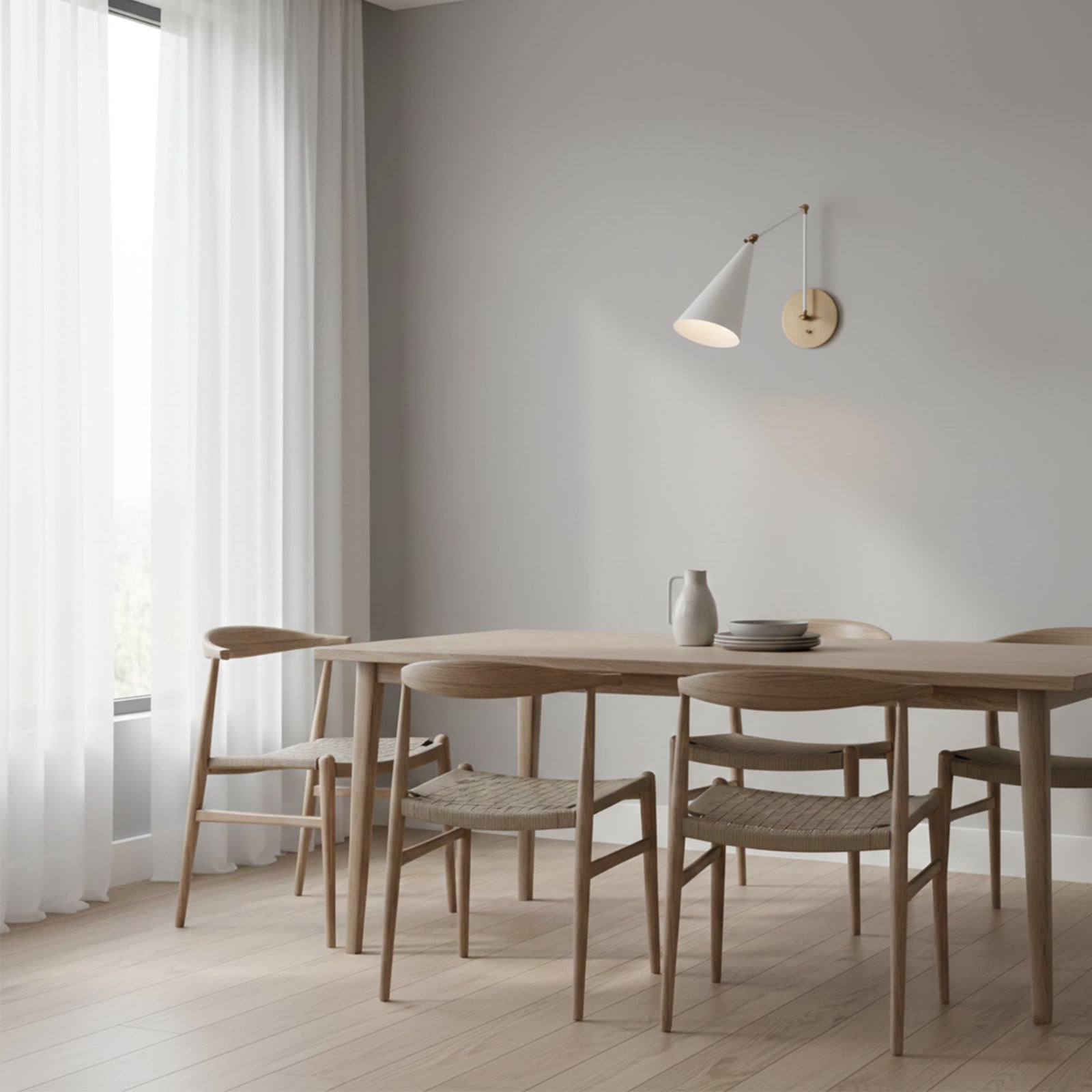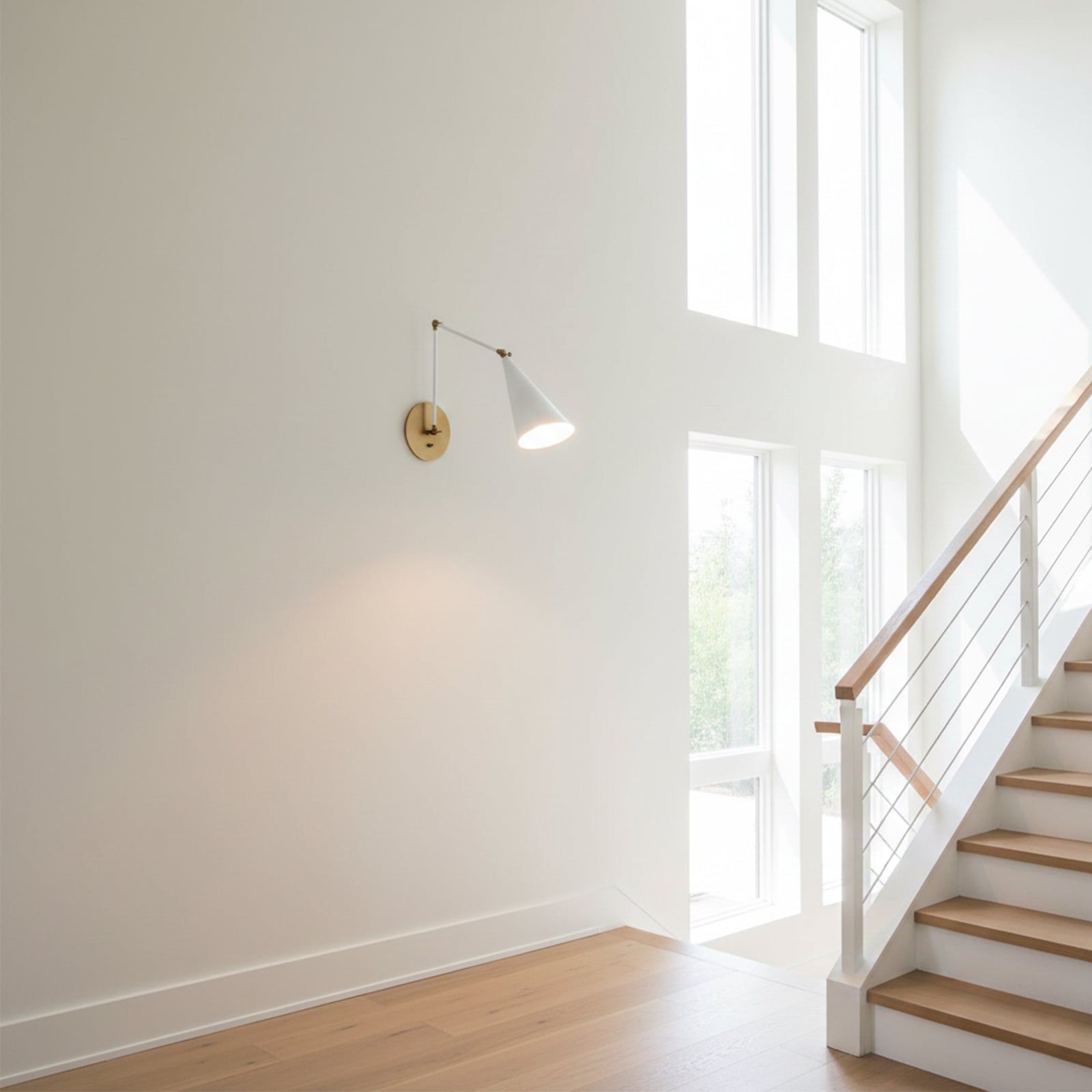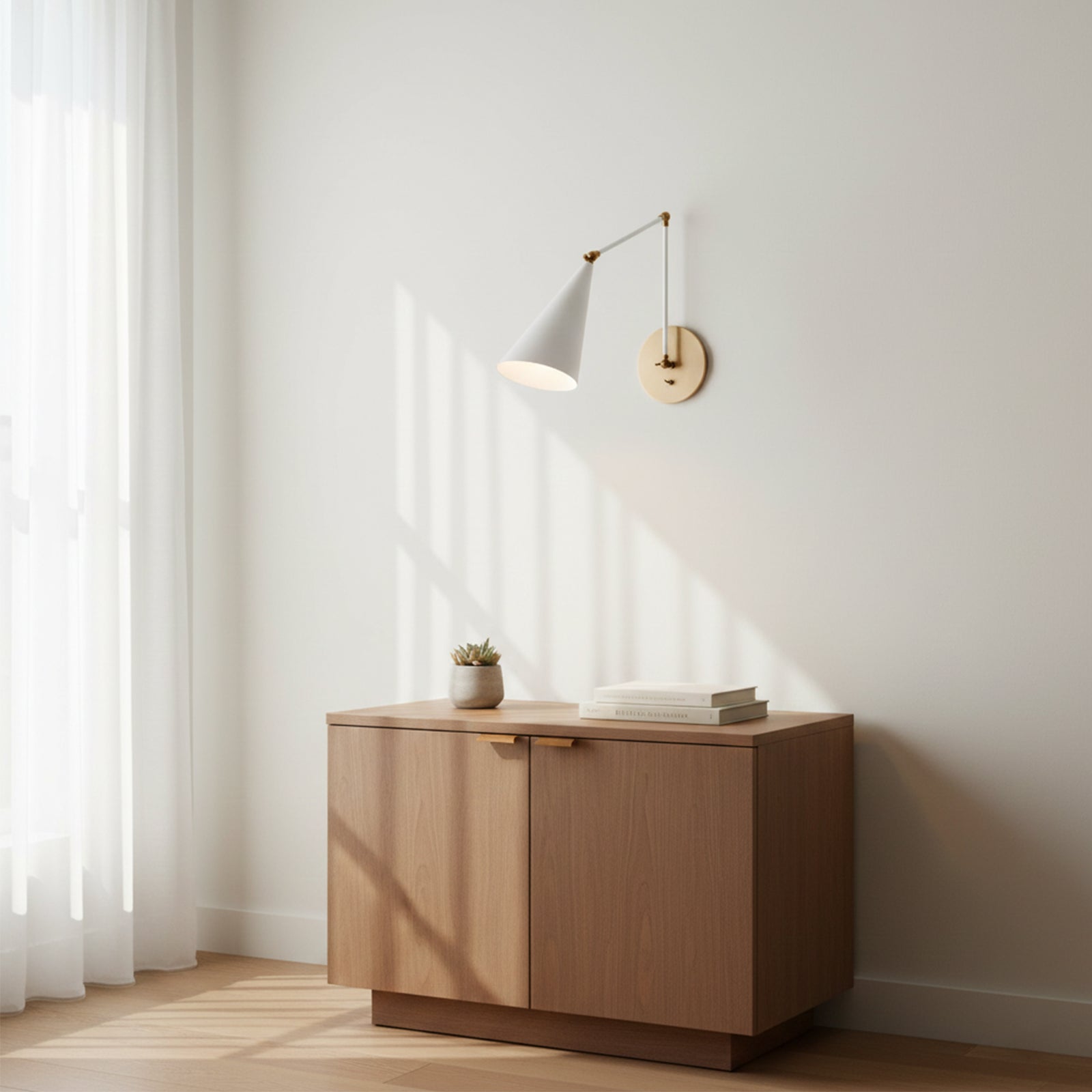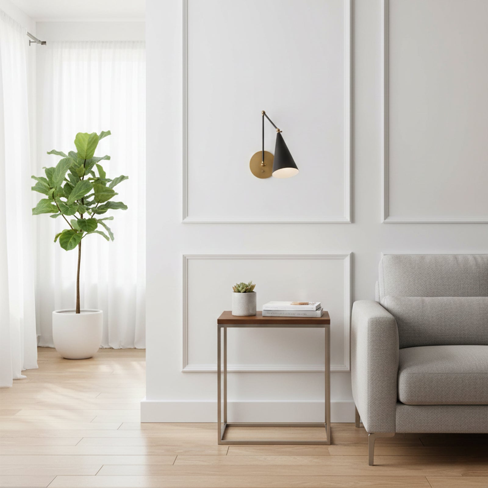 Elevate the style and function of any room with the Arm Cone Shade Wall Light! Featuring a sleek, movable arm design, this Mid-Century Modern-inspired sconce allows you to direct light wherever it's needed. With a brass-toned wall plate and a distinctive conical shade, it is perfect for functional lighting in studies, or as a stylish accent in hallways and living rooms.