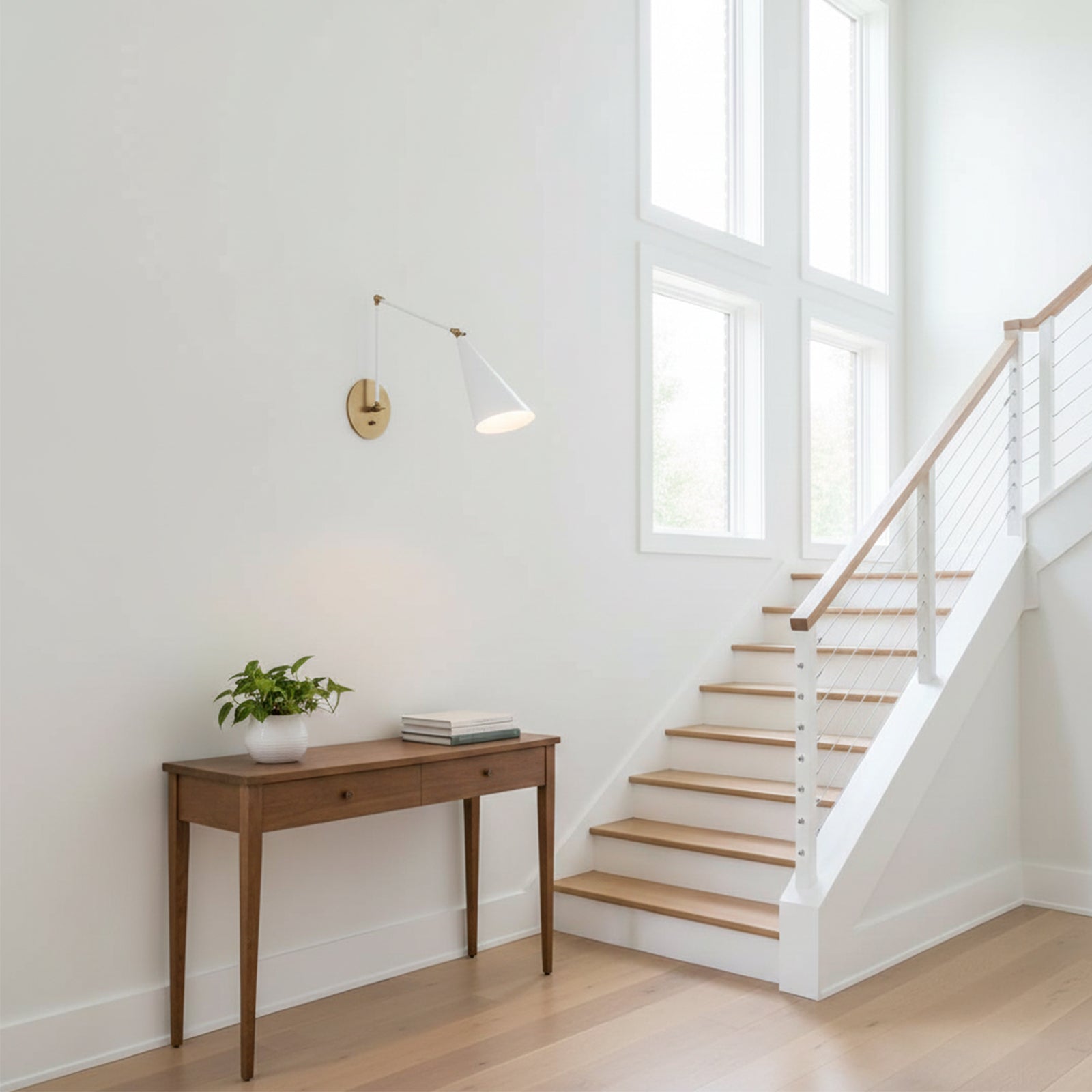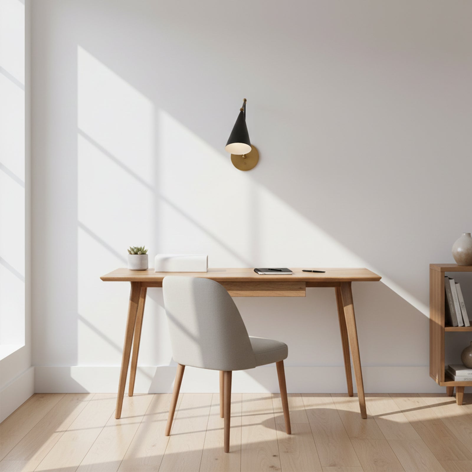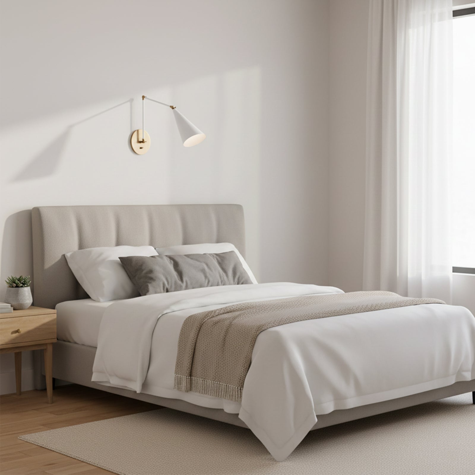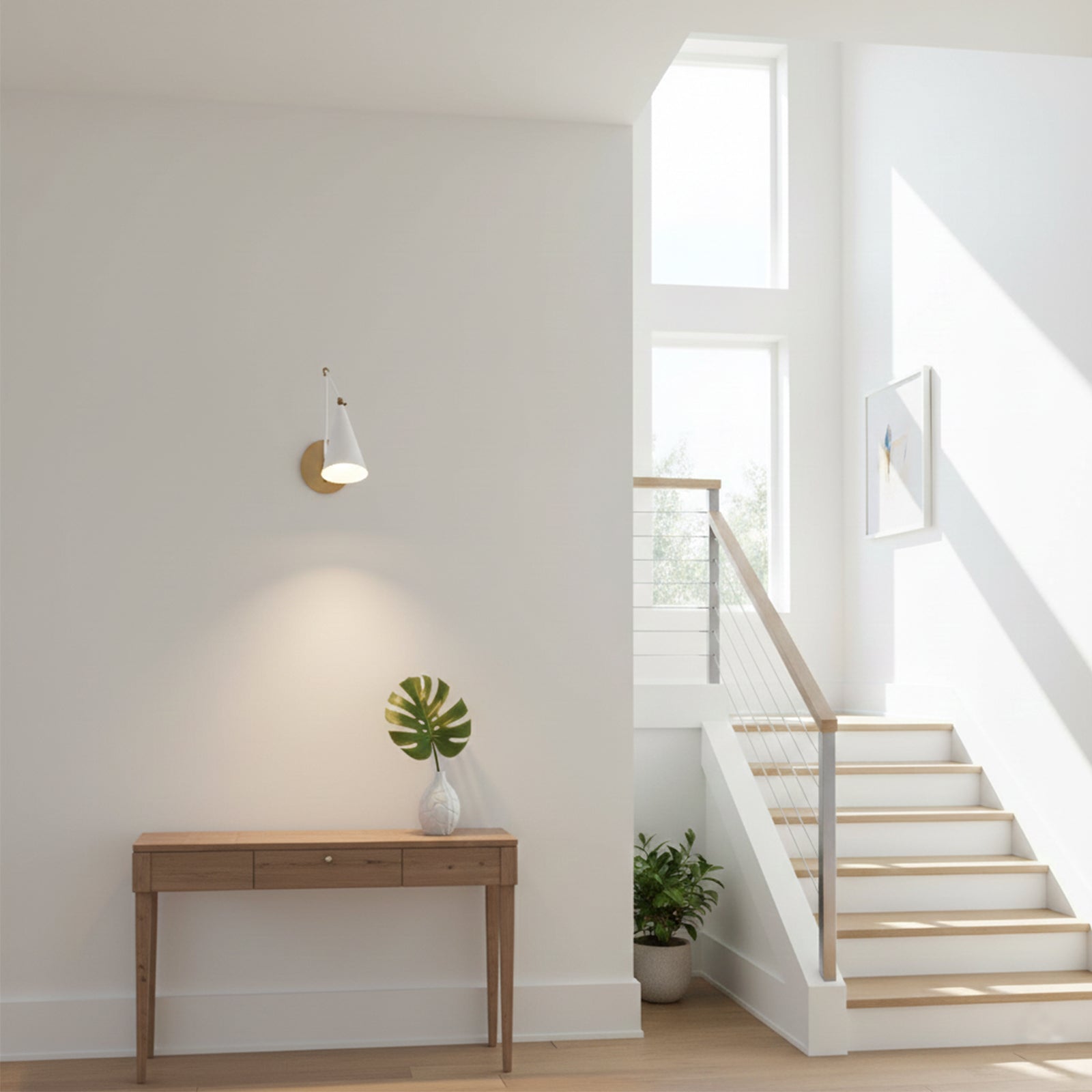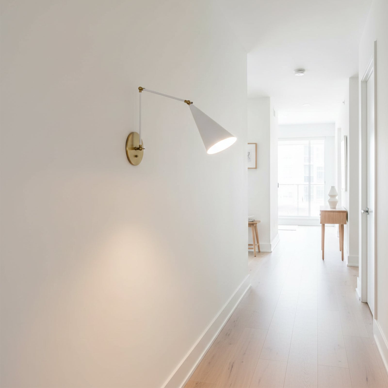 Elevate the style and function of any room with the Arm Cone Shade Wall Light! Featuring a sleek, movable arm design, this Mid-Century Modern-inspired sconce allows you to direct light wherever it's needed. With a brass-toned wall plate and a distinctive conical shade, it is perfect for functional lighting in studies, or as a stylish accent in hallways and living rooms.