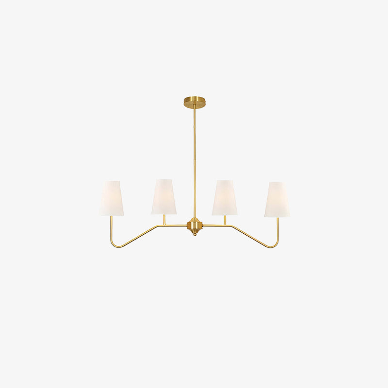 Daphne Brass Linear American Chandelier blends modern elegance with simplicity, featuring a brass-finished linear frame and four cone-shaped fabric lampshades that emit a soft, diffused glow. The streamlined design of the Brass Modern Linear Chandelier makes it ideal for contemporary spaces such as dining rooms, kitchens, or living areas. The slender metal arms extend gracefully from the central hub, creating a balanced, minimalist aesthetic.