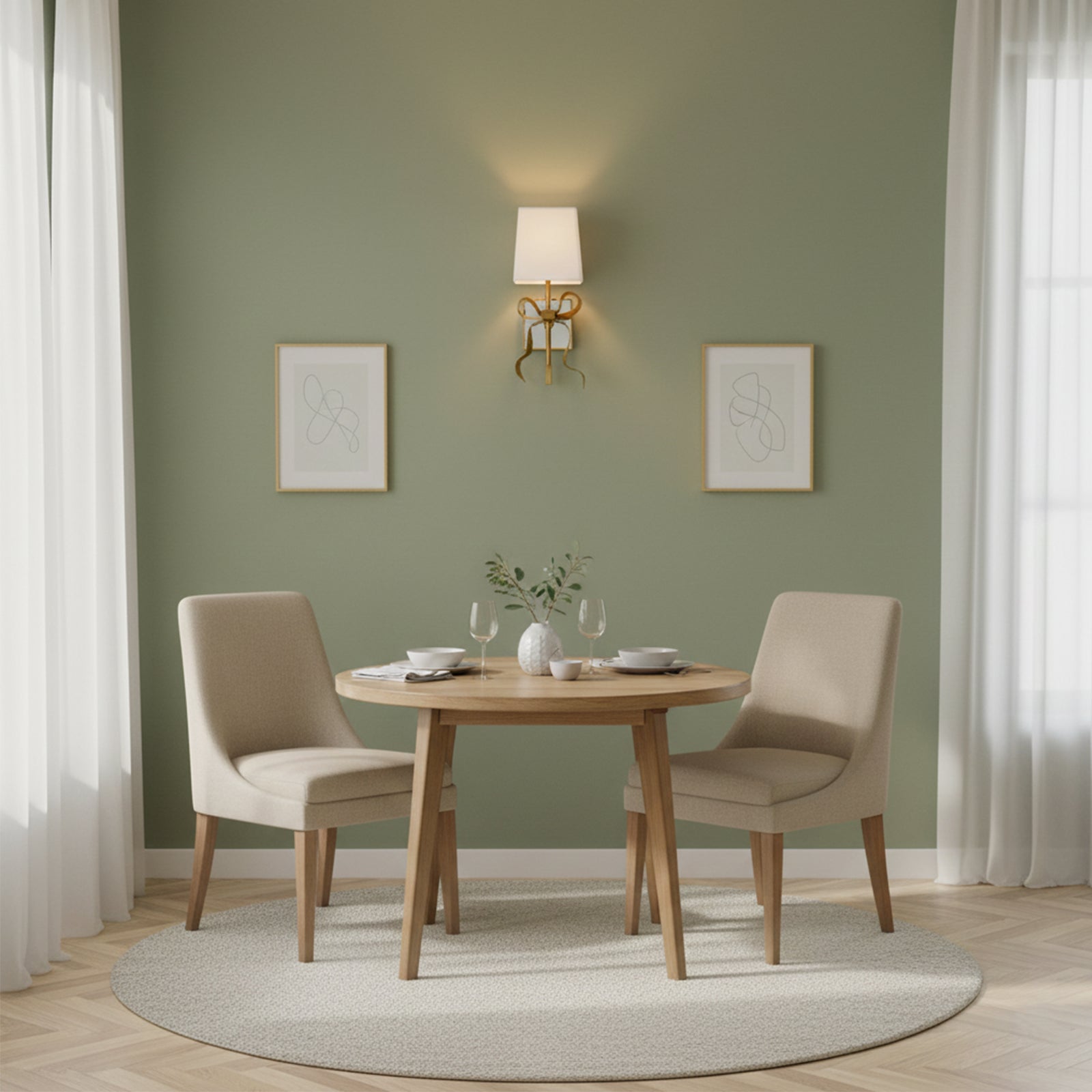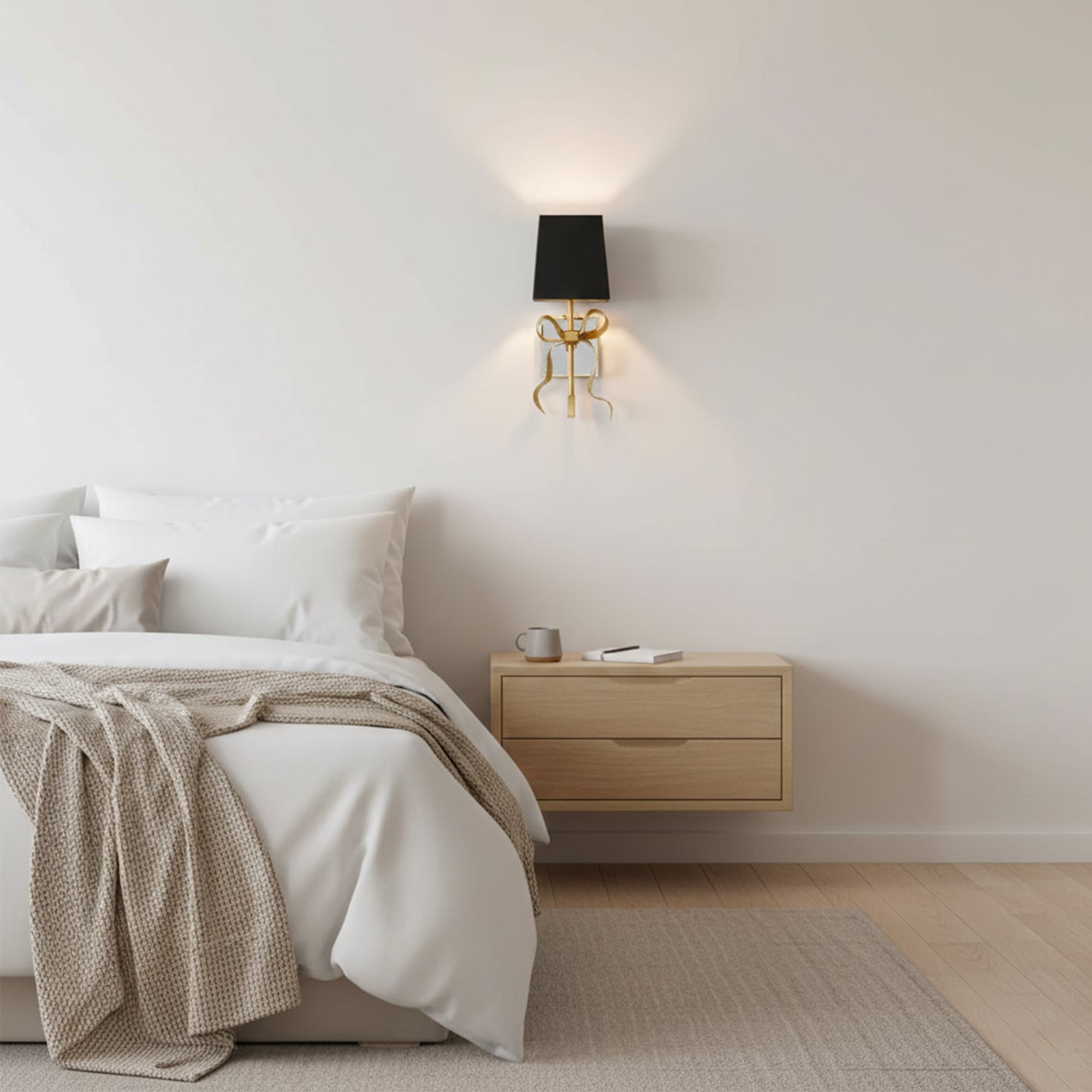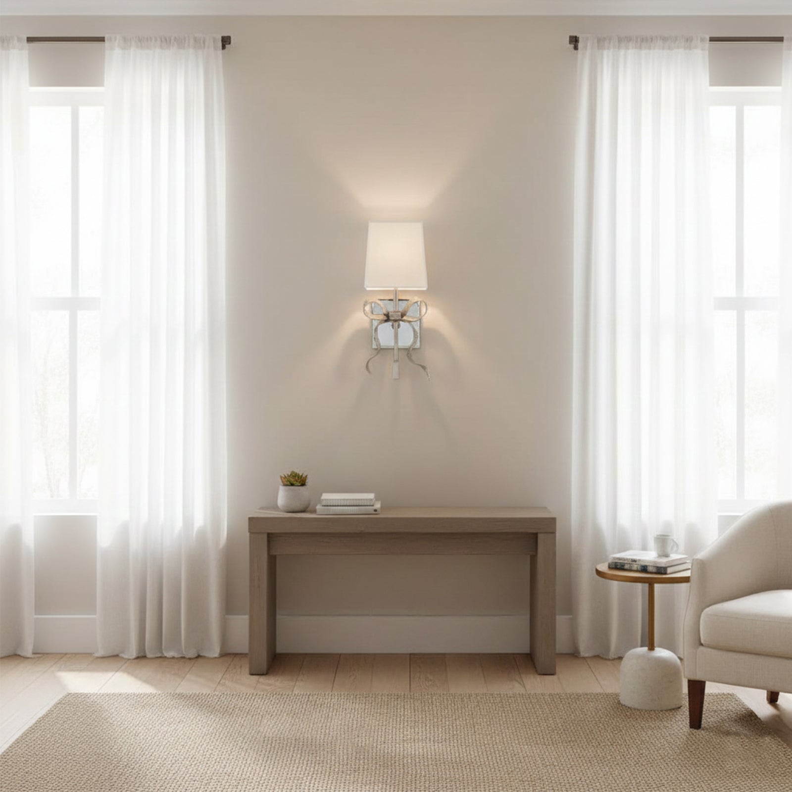 Illuminate your space with the charming Bow Arm Linen Shade Wall Lamp.The fresh linen shade paired with an elegant bow arm exudes a design aesthetic that adds a touch of sophistication and elegance to any room. The fixture's beautiful curve and soft shade combine to create an inviting glow. Let its stunning design inspire your decor!