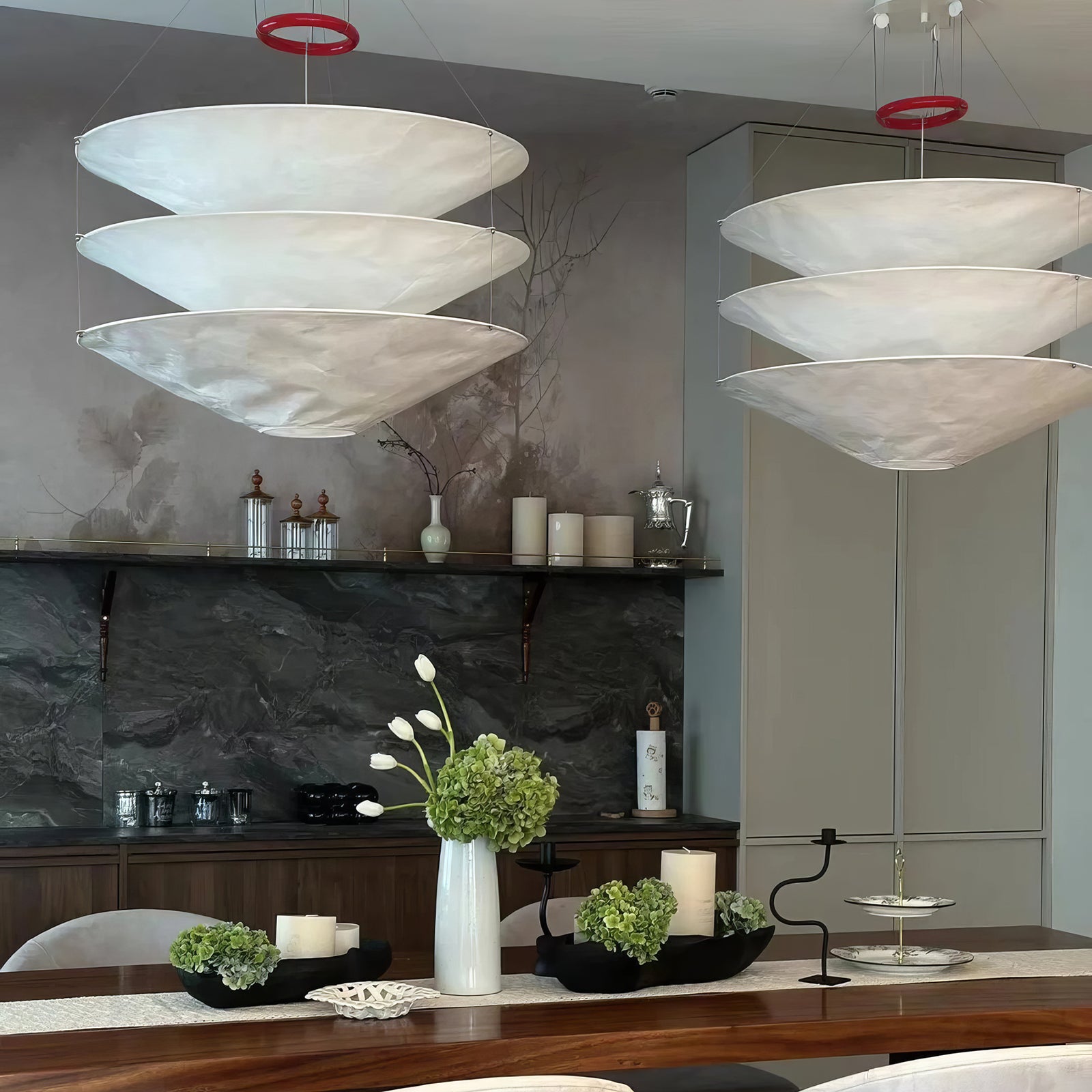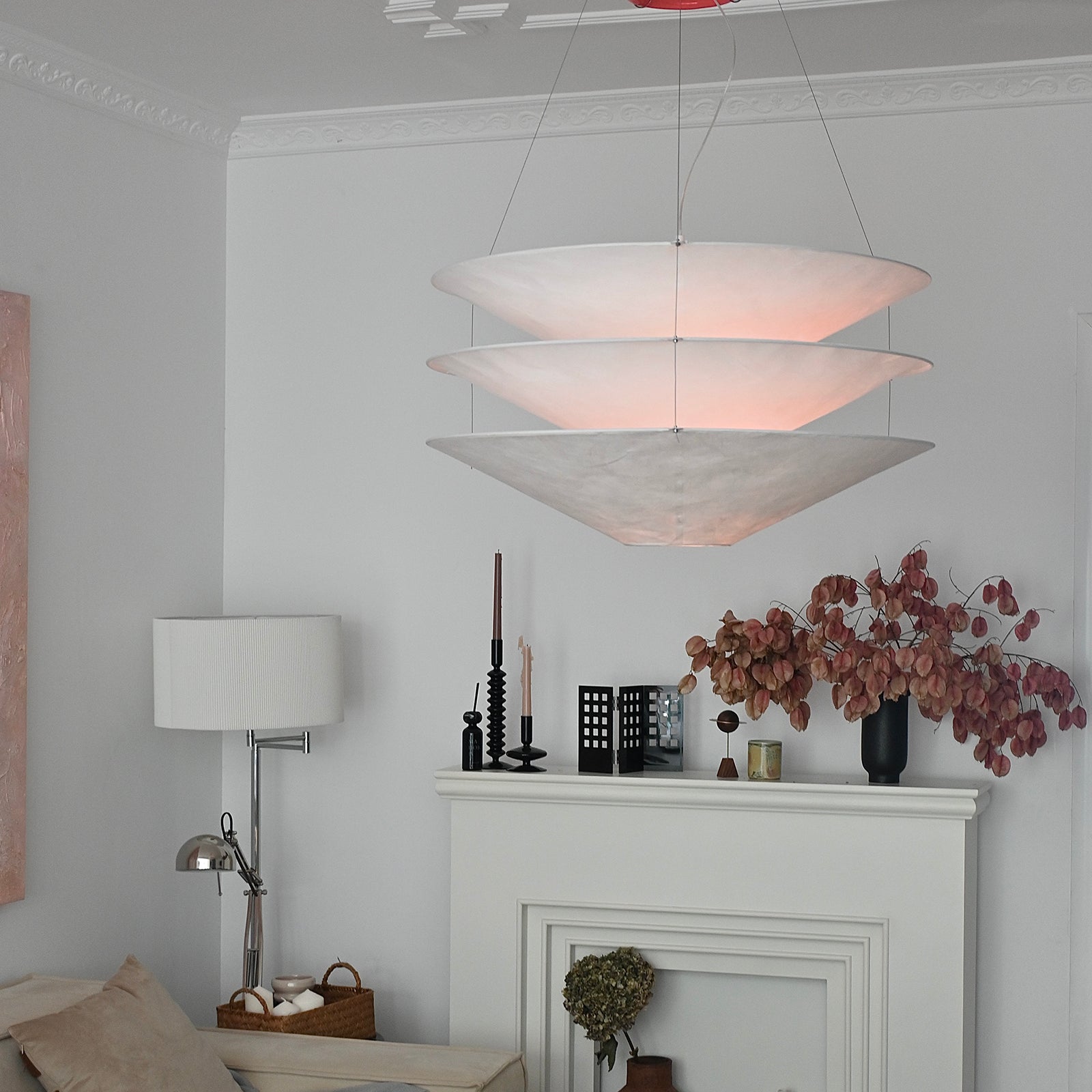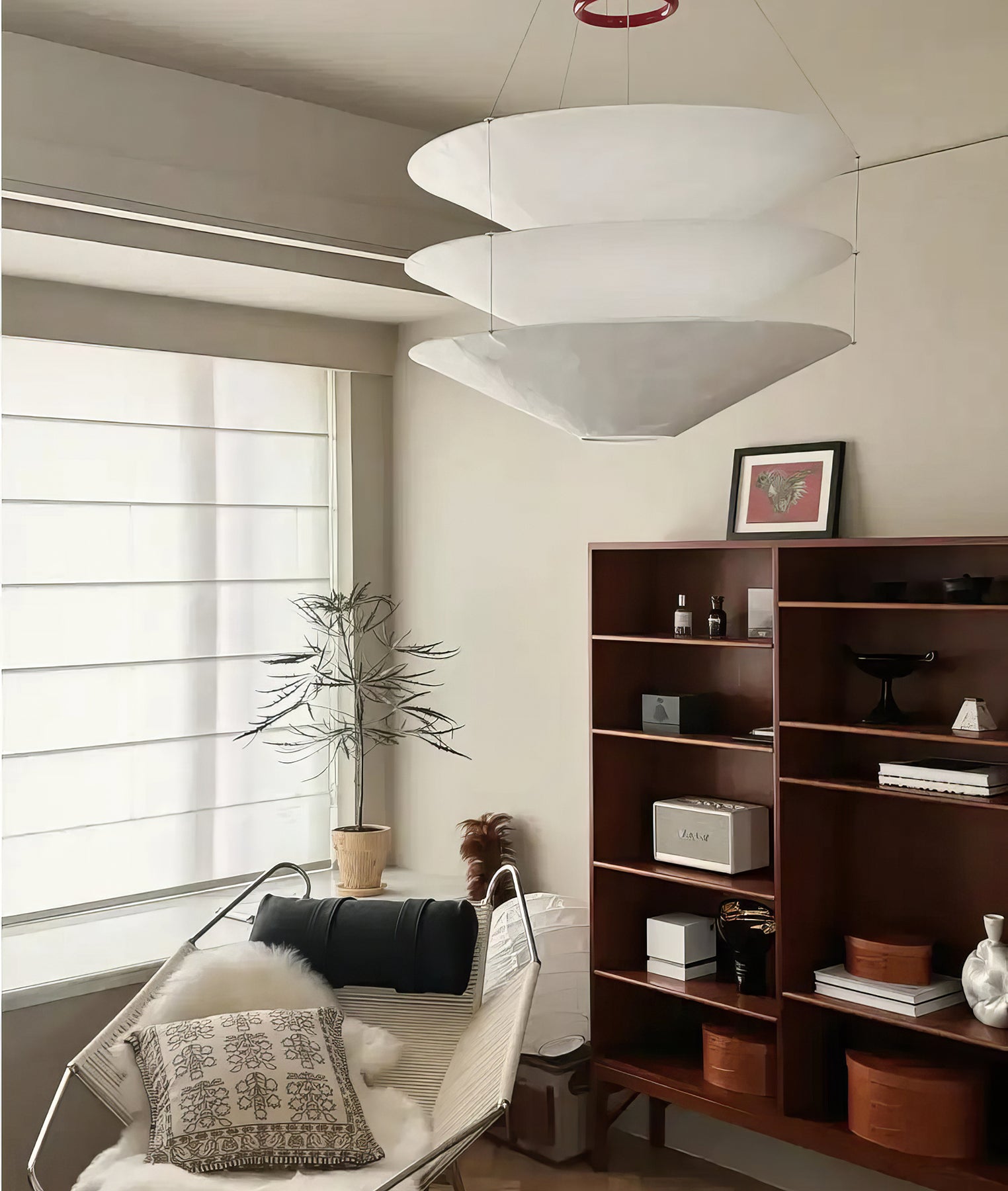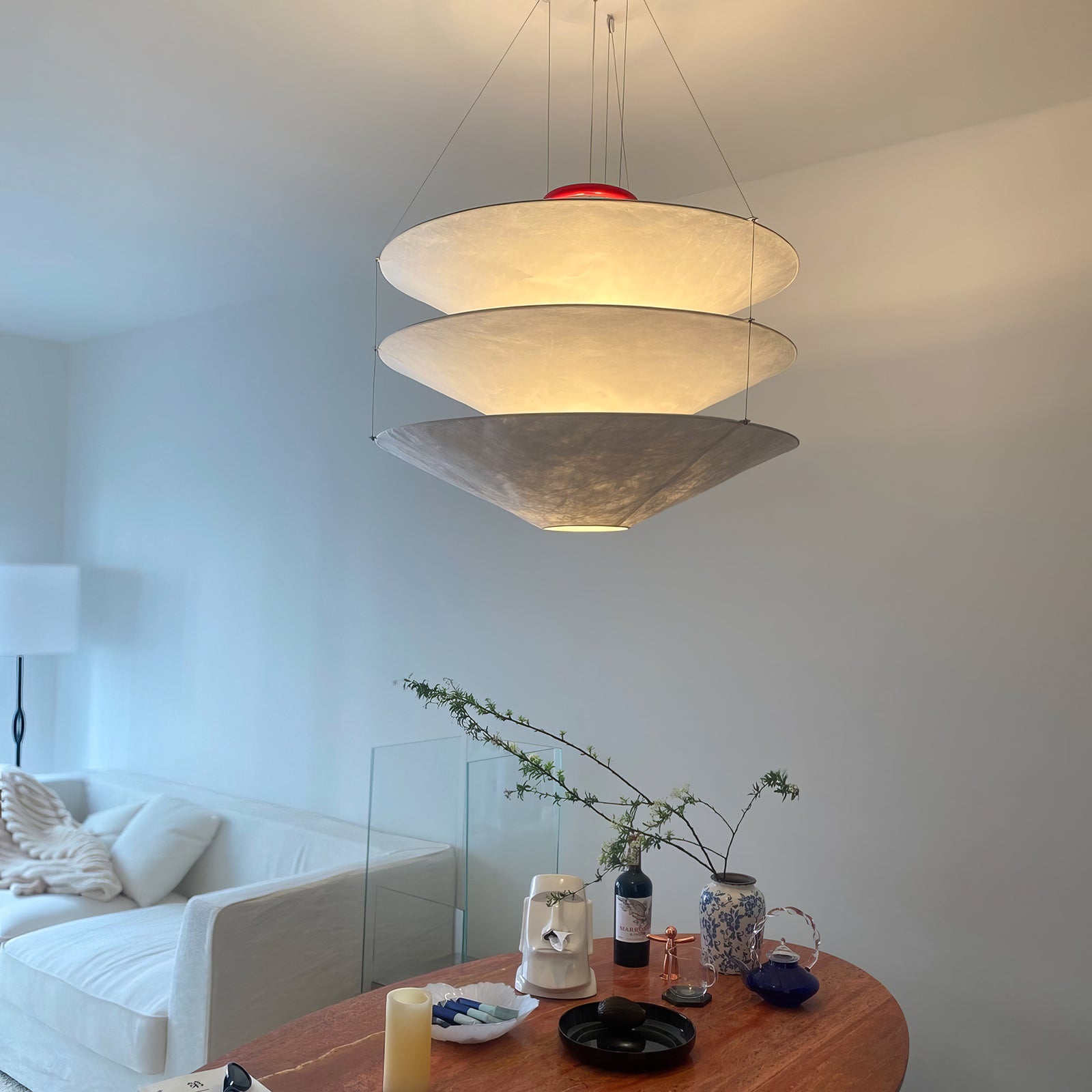 Elevate your space with our Floatation pendant lamp. This sculptural masterpiece boasts three delicate Japanese paper lampshades, creating an ethereal atmosphere with its soft and diffuse lighting. Easily adjust the height with red metal rings. Bring a touch of serenity to any room.