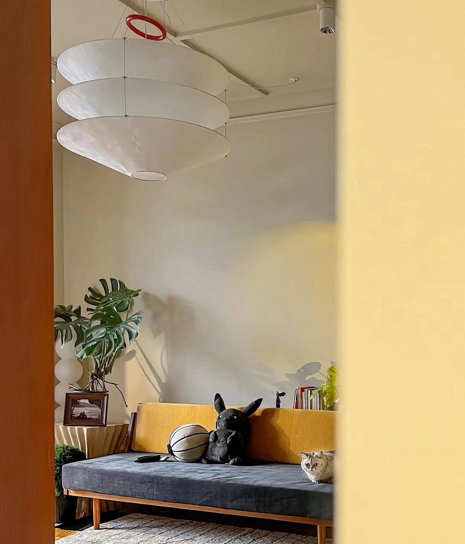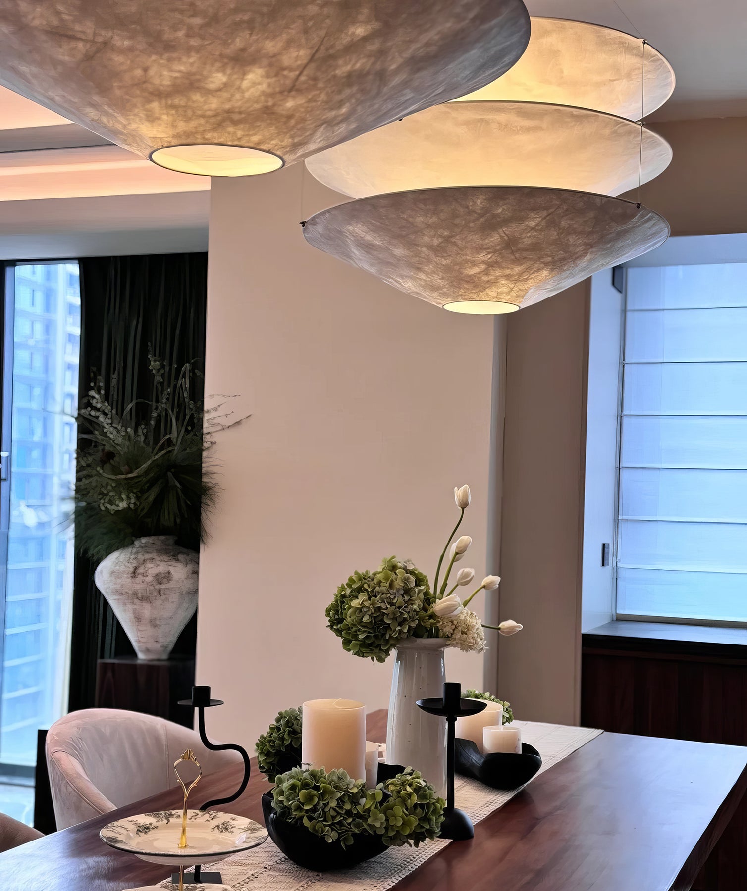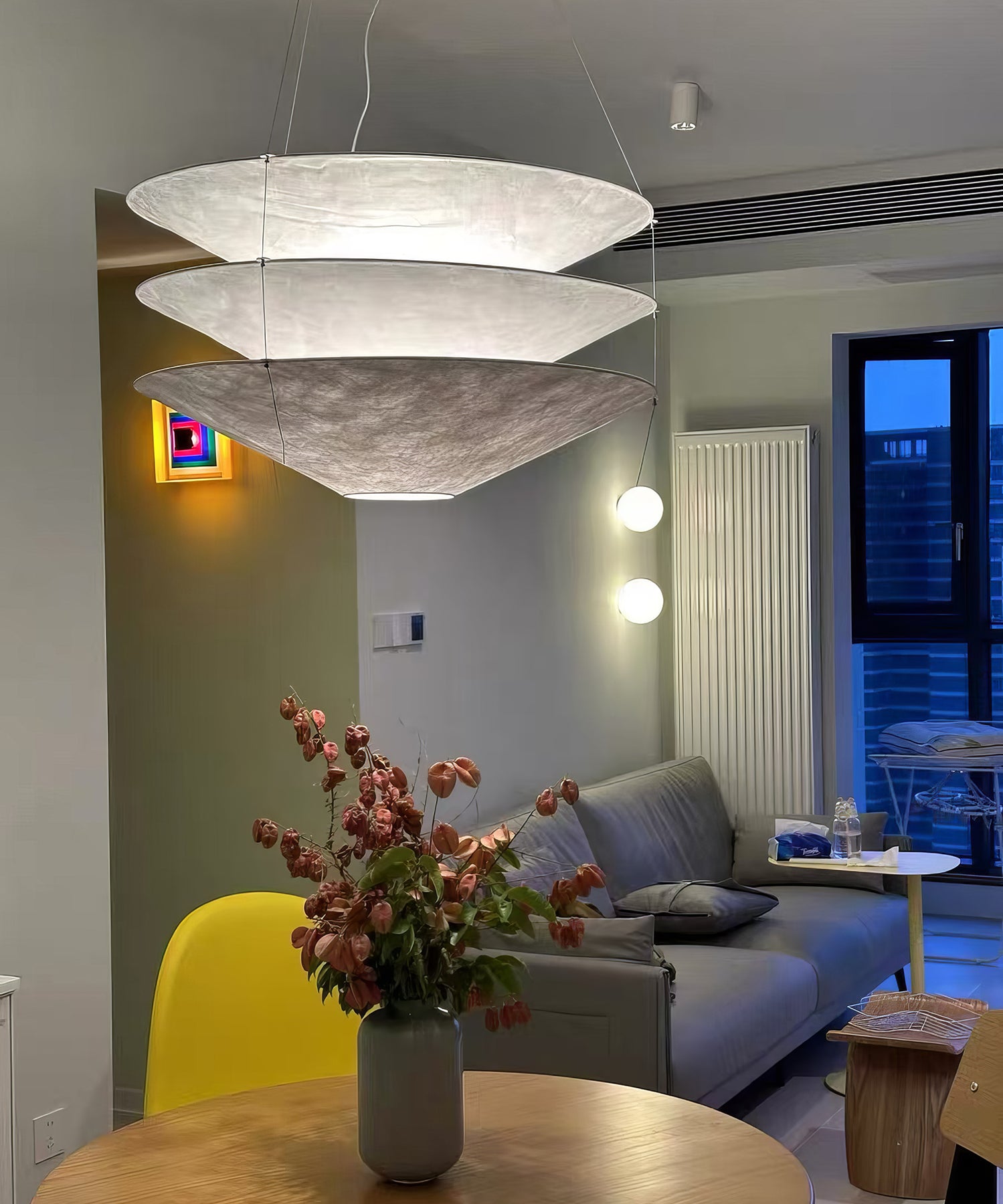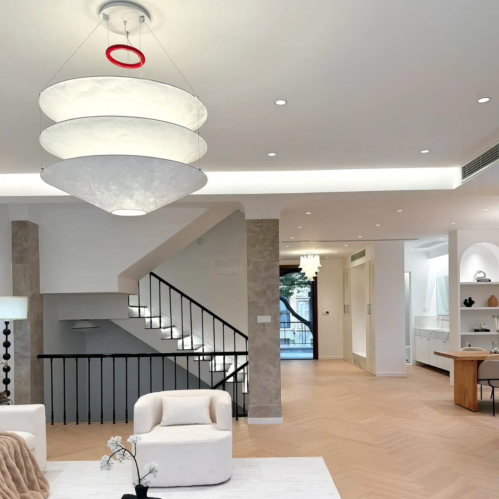 Elevate your space with our Floatation pendant lamp. This sculptural masterpiece boasts three delicate Japanese paper lampshades, creating an ethereal atmosphere with its soft and diffuse lighting. Easily adjust the height with red metal rings. Bring a touch of serenity to any room.