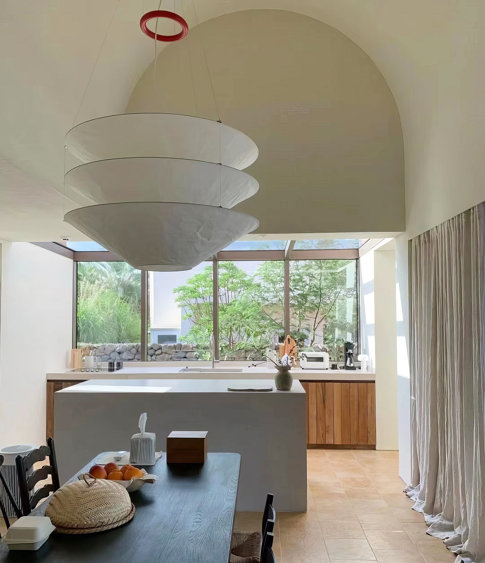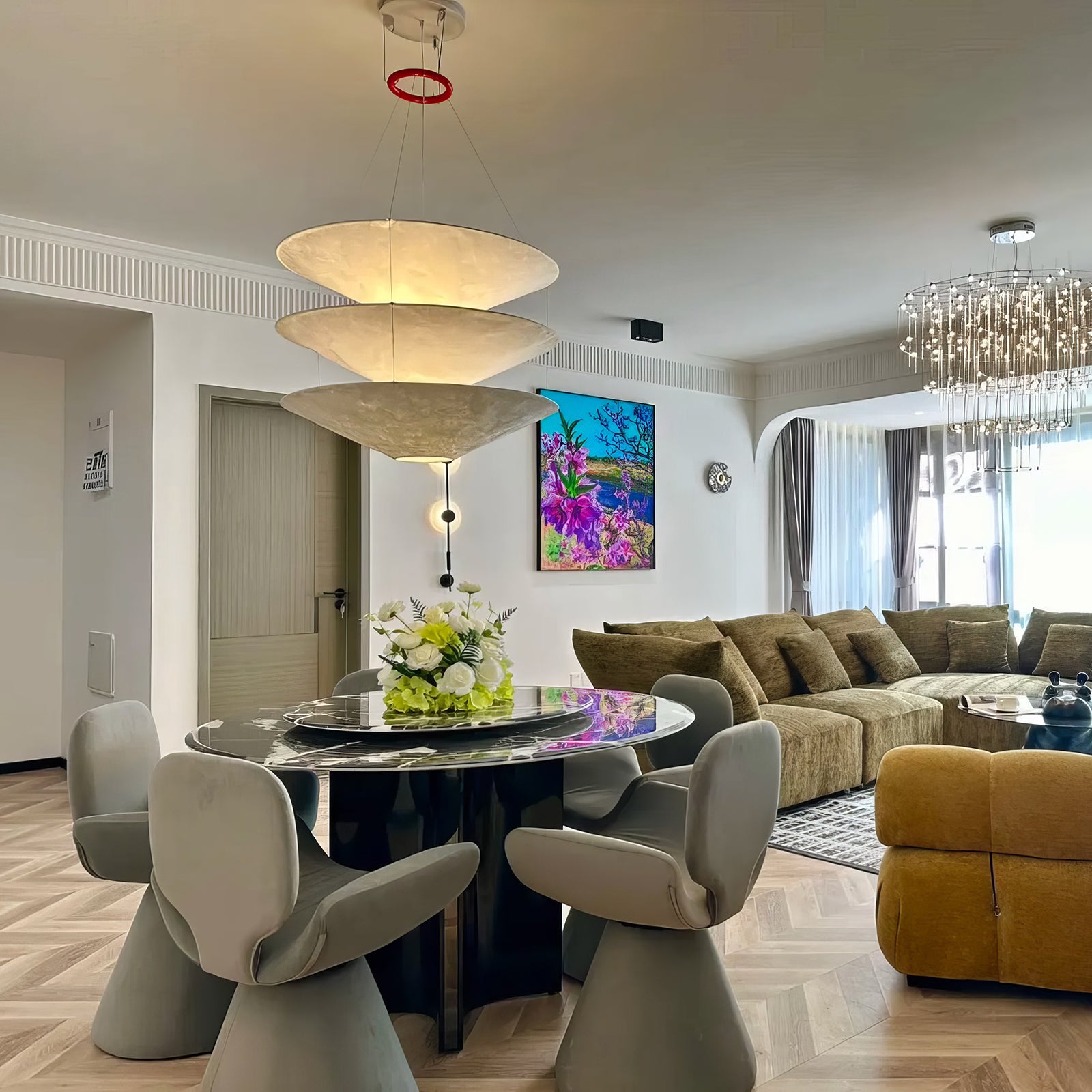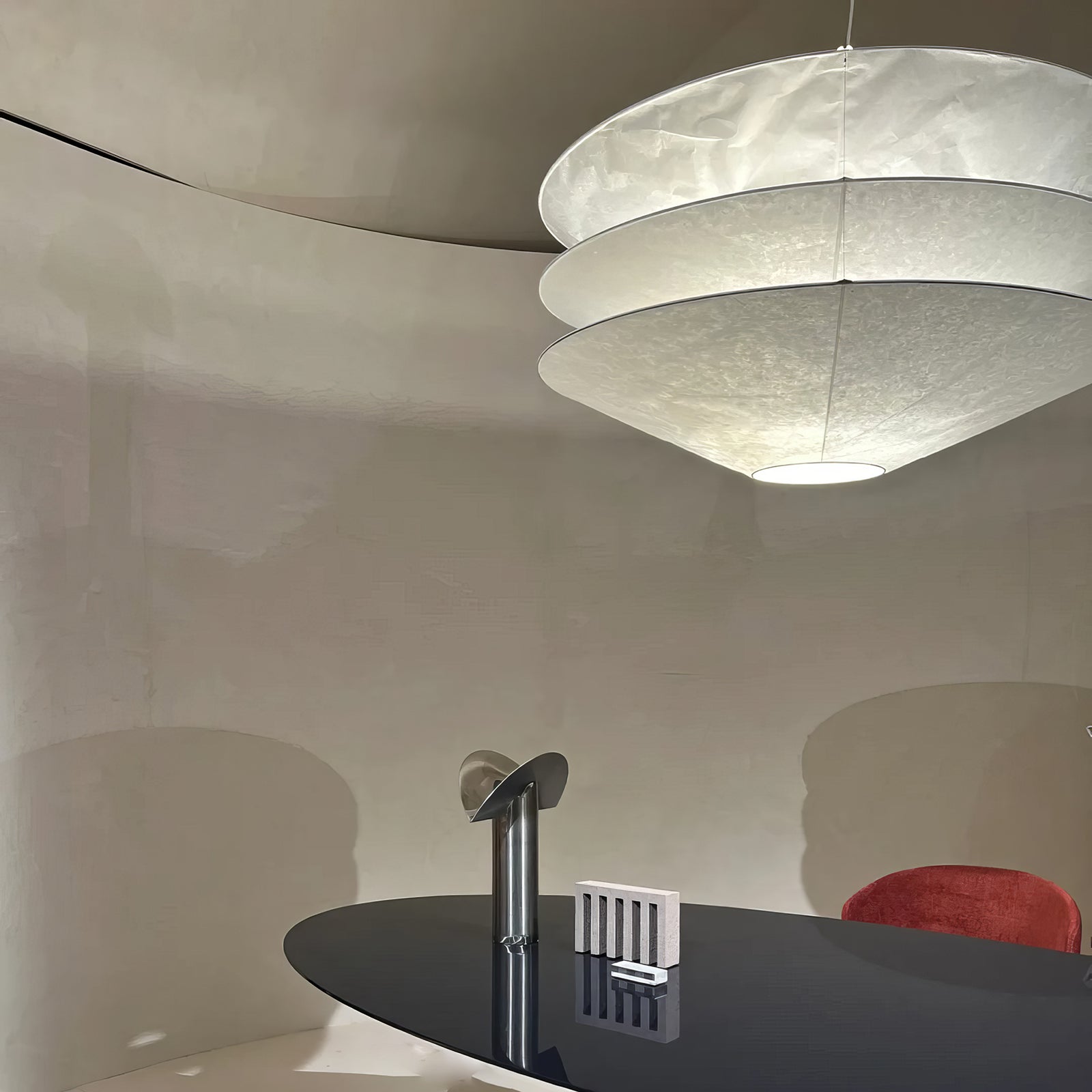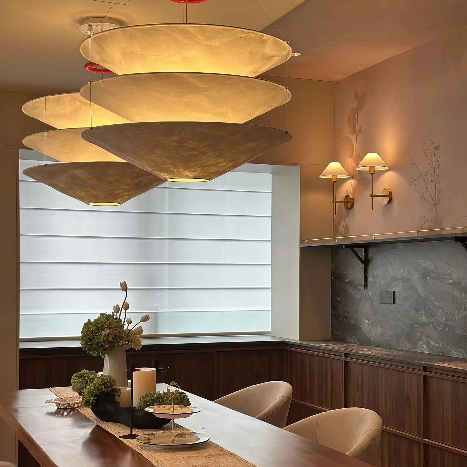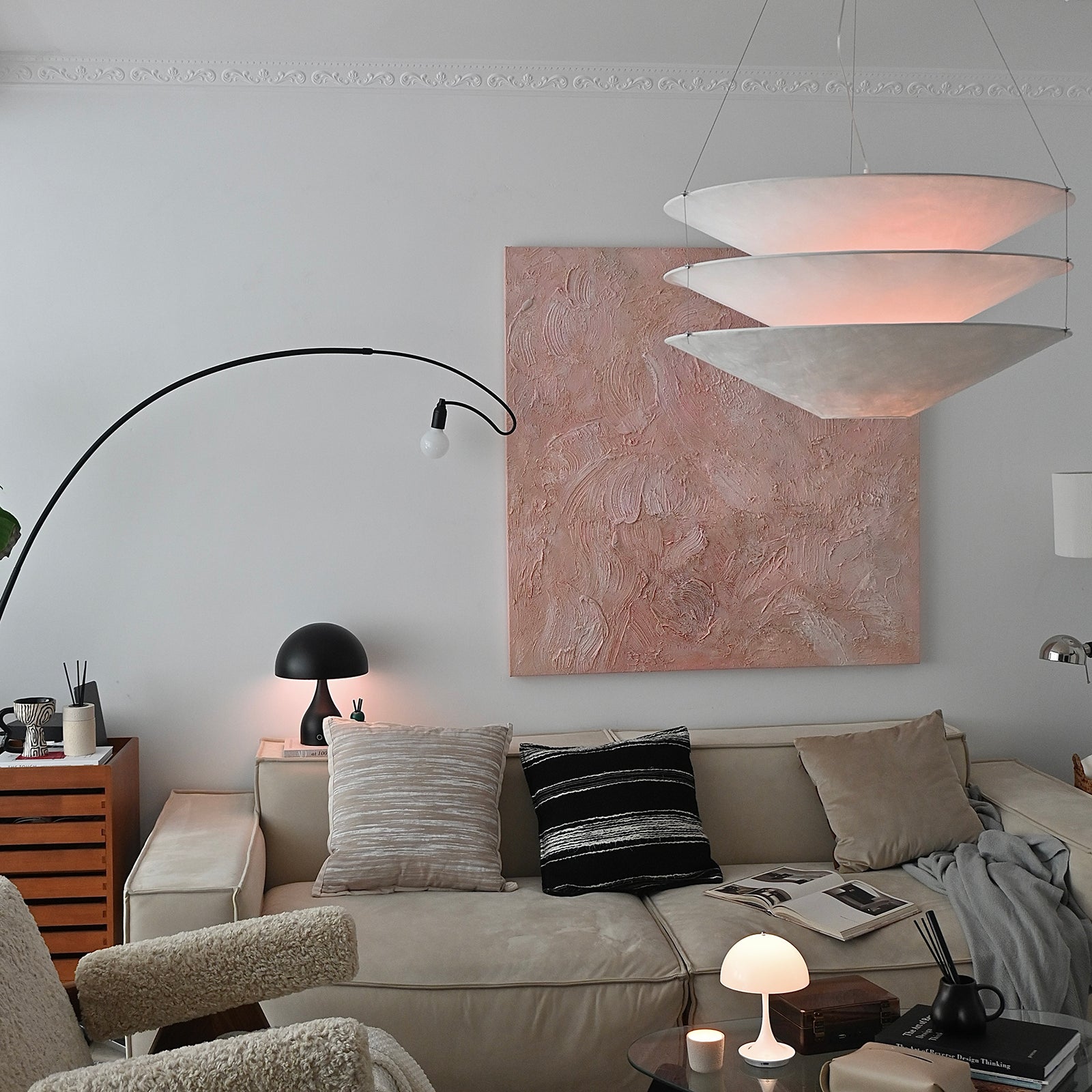 Elevate your space with our Floatation pendant lamp. This sculptural masterpiece boasts three delicate Japanese paper lampshades, creating an ethereal atmosphere with its soft and diffuse lighting. Easily adjust the height with red metal rings. Bring a touch of serenity to any room.