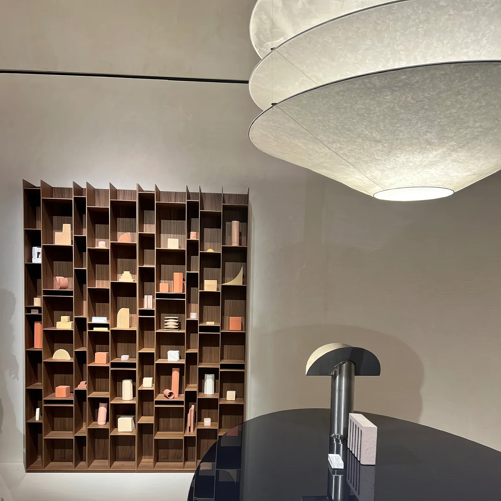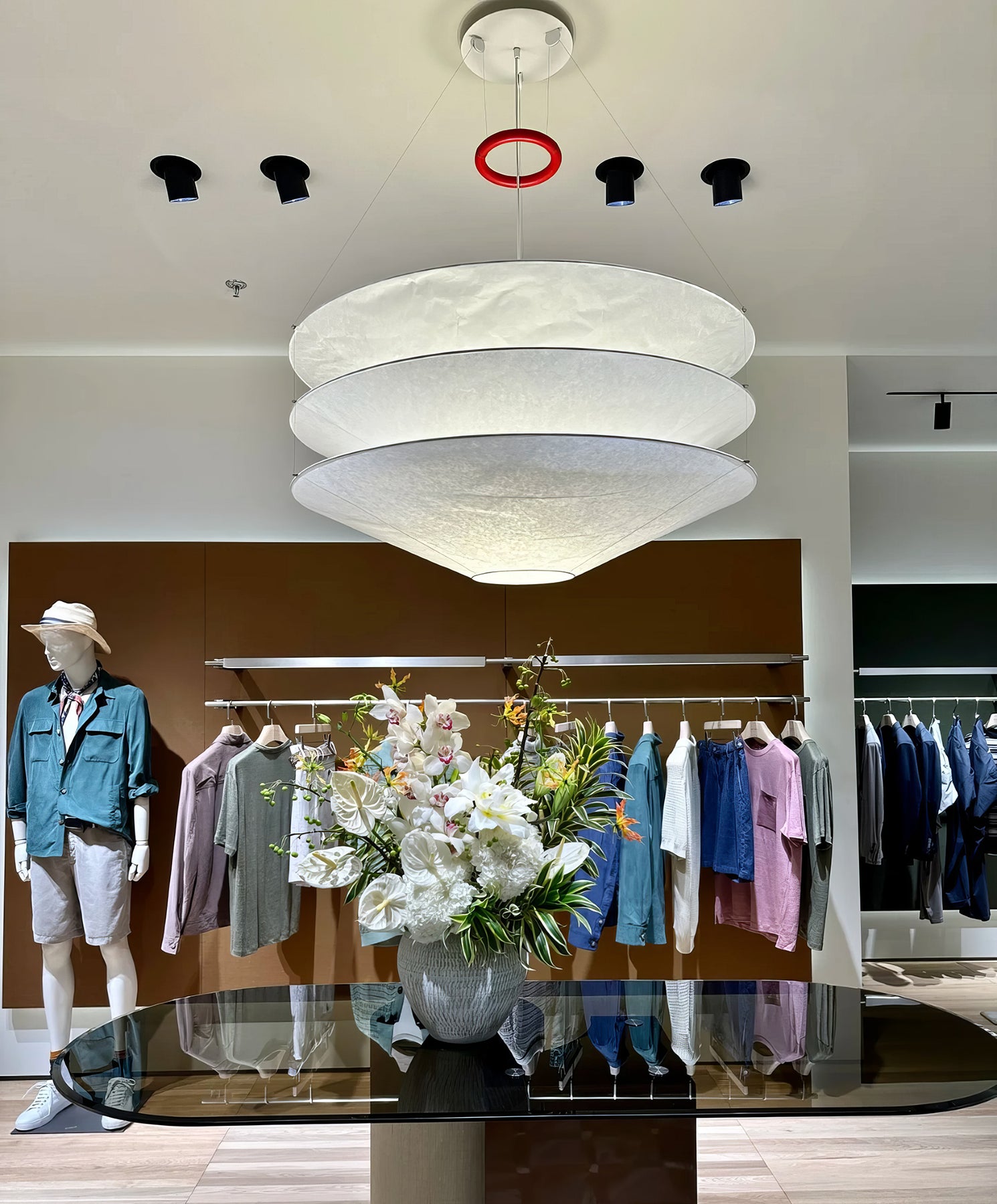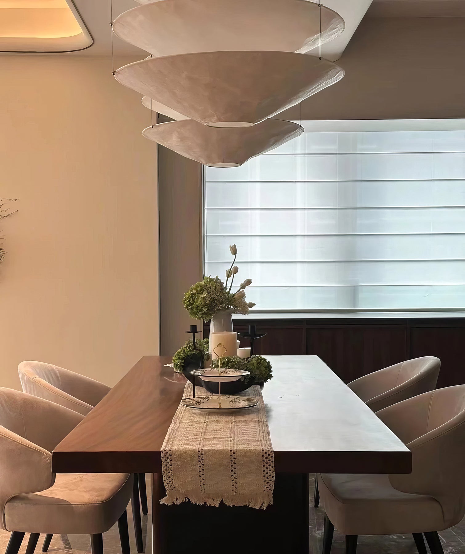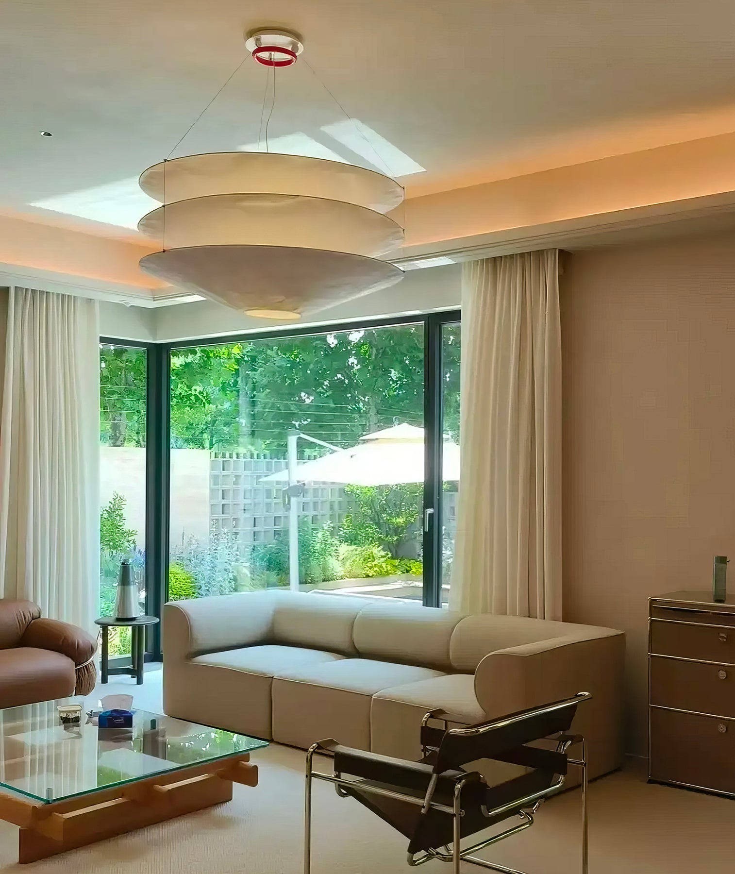 Elevate your space with our Floatation pendant lamp. This sculptural masterpiece boasts three delicate Japanese paper lampshades, creating an ethereal atmosphere with its soft and diffuse lighting. Easily adjust the height with red metal rings. Bring a touch of serenity to any room.