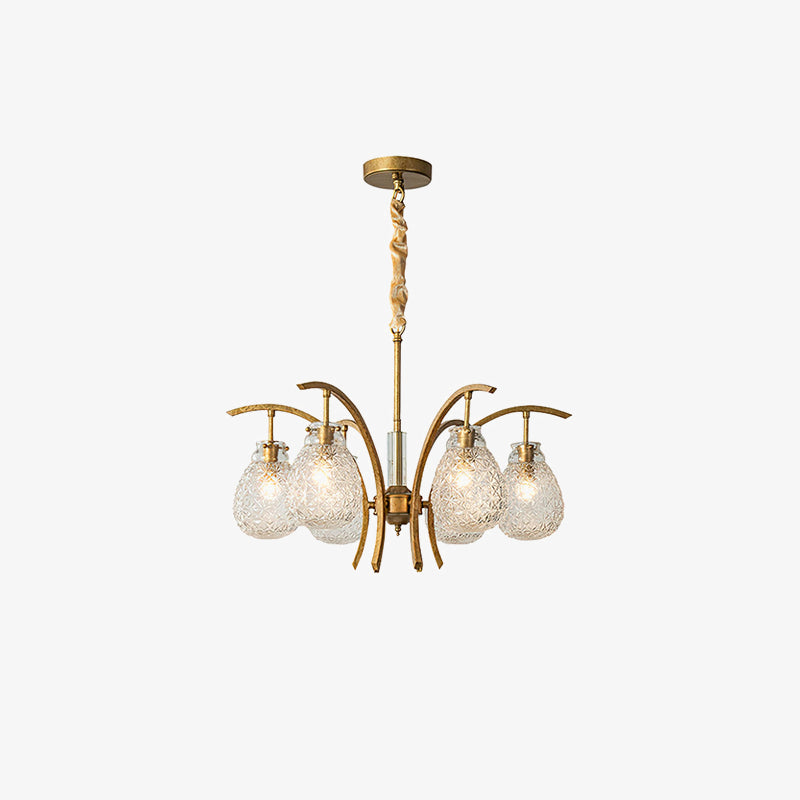 The Gold Floral Glass Chandelier features a traditional curved lampshade made of clear striped glass with a warm brass frame that mimics the beauty of a blooming flower with eye-catching details. Use it to add a touch of elegance to your dining room, living room, bedroom, and more.
