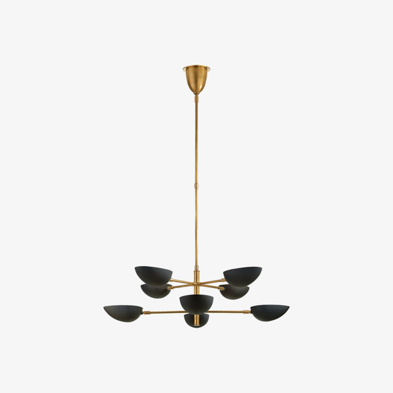 Add a modern touch to your living or dining room with the Patterned Two-Tier Chandelier. Featuring a sleek metal design and a black or white curved shade, this chandelier provides warm light and a stunning sculptural effect. Elevate your space with this mid-century piece.