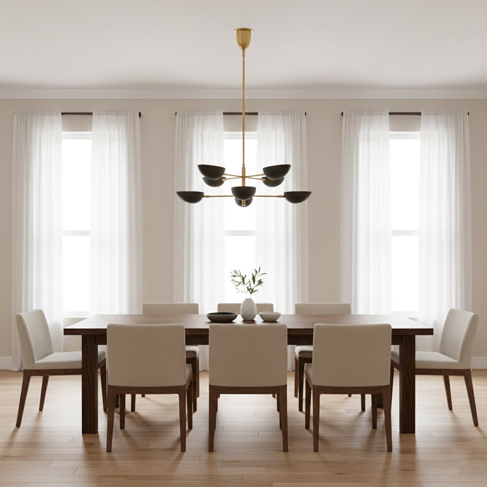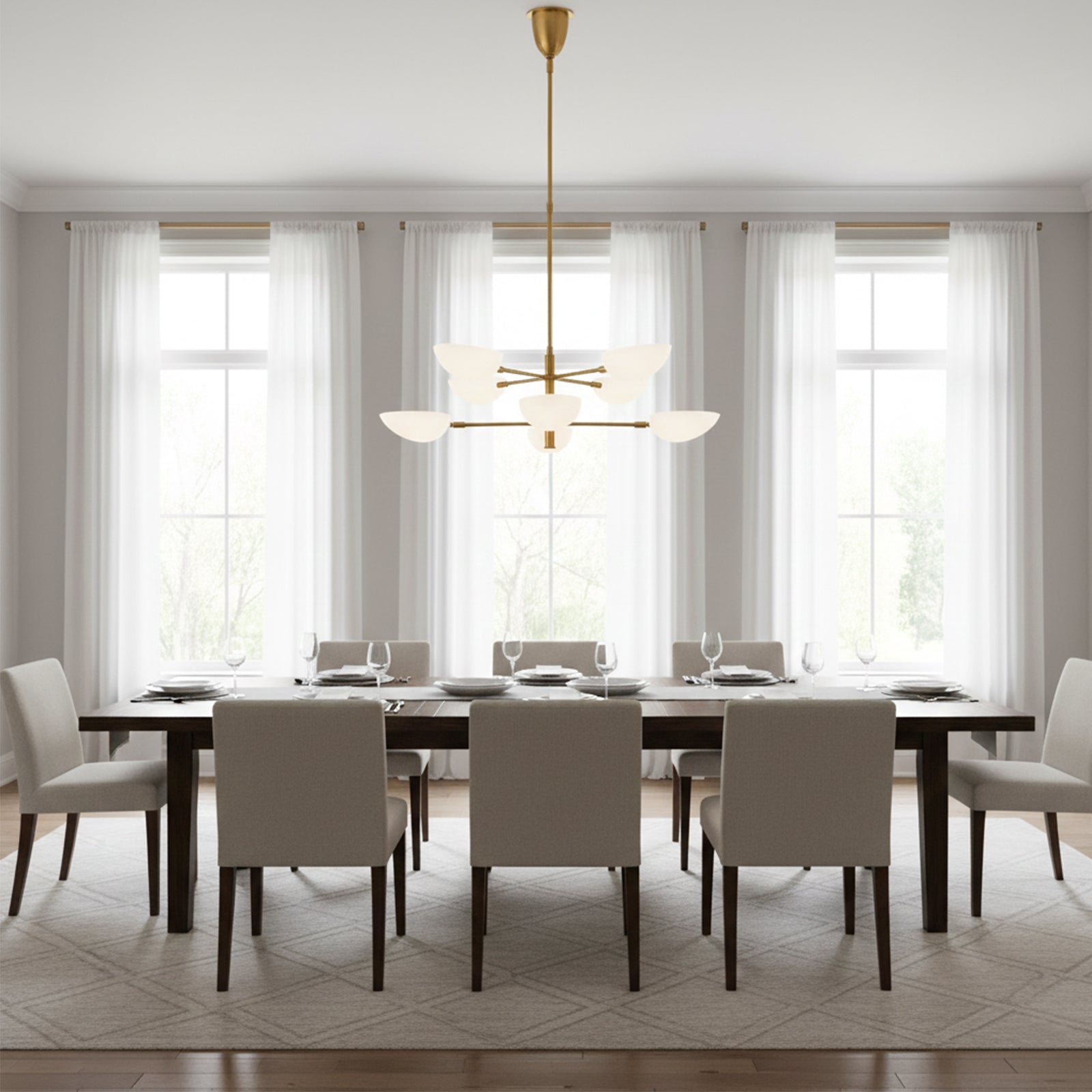 Featuring a sleek metal design and a striking two-tier structure, this chandelier provides warm light and a stunning sculptural effect. The fixture embodies a true mid-century aesthetic with its extended arms and geometric form. You can choose a black or white curved shade to complement your decor. Instantly elevate your space with this elegant and impactful piece.