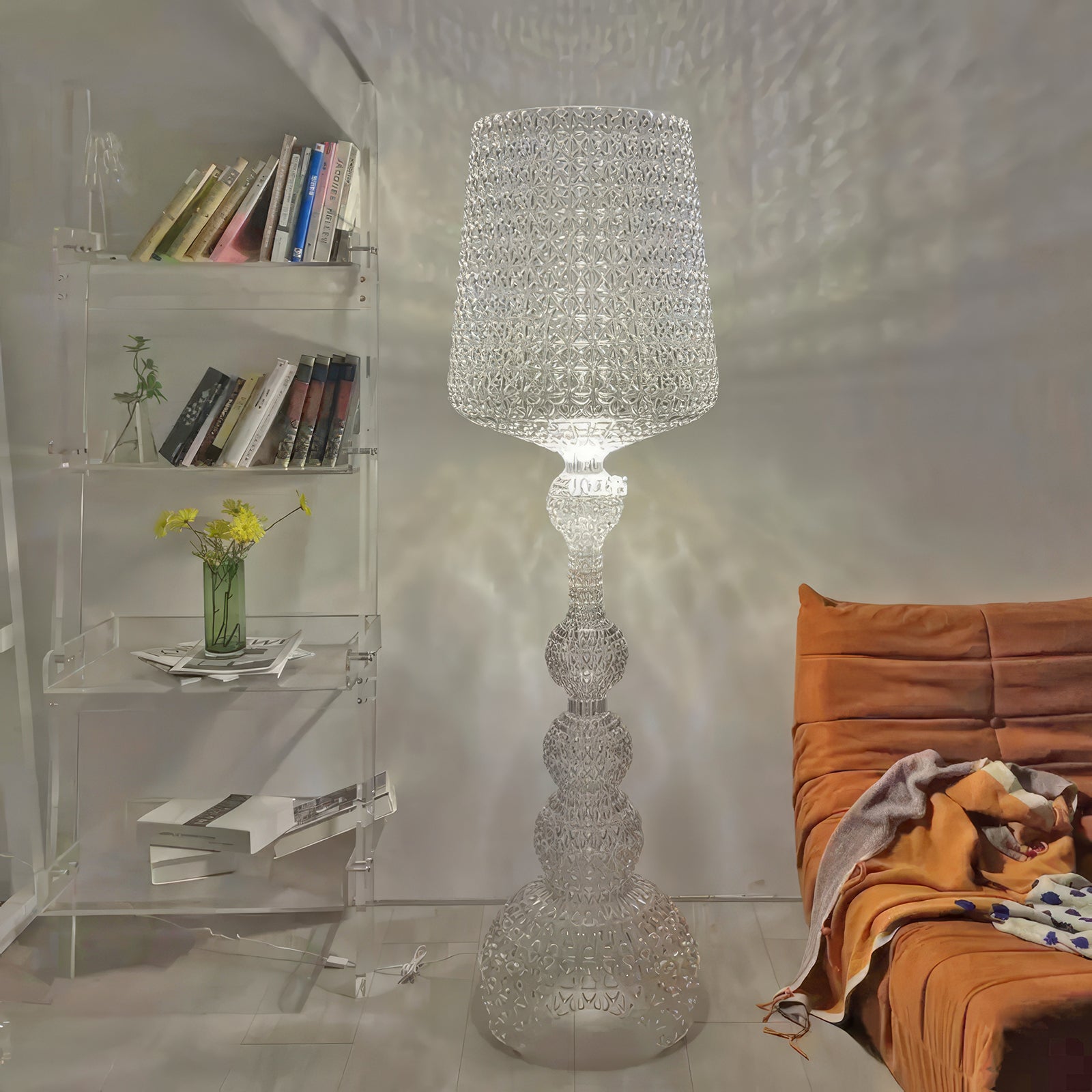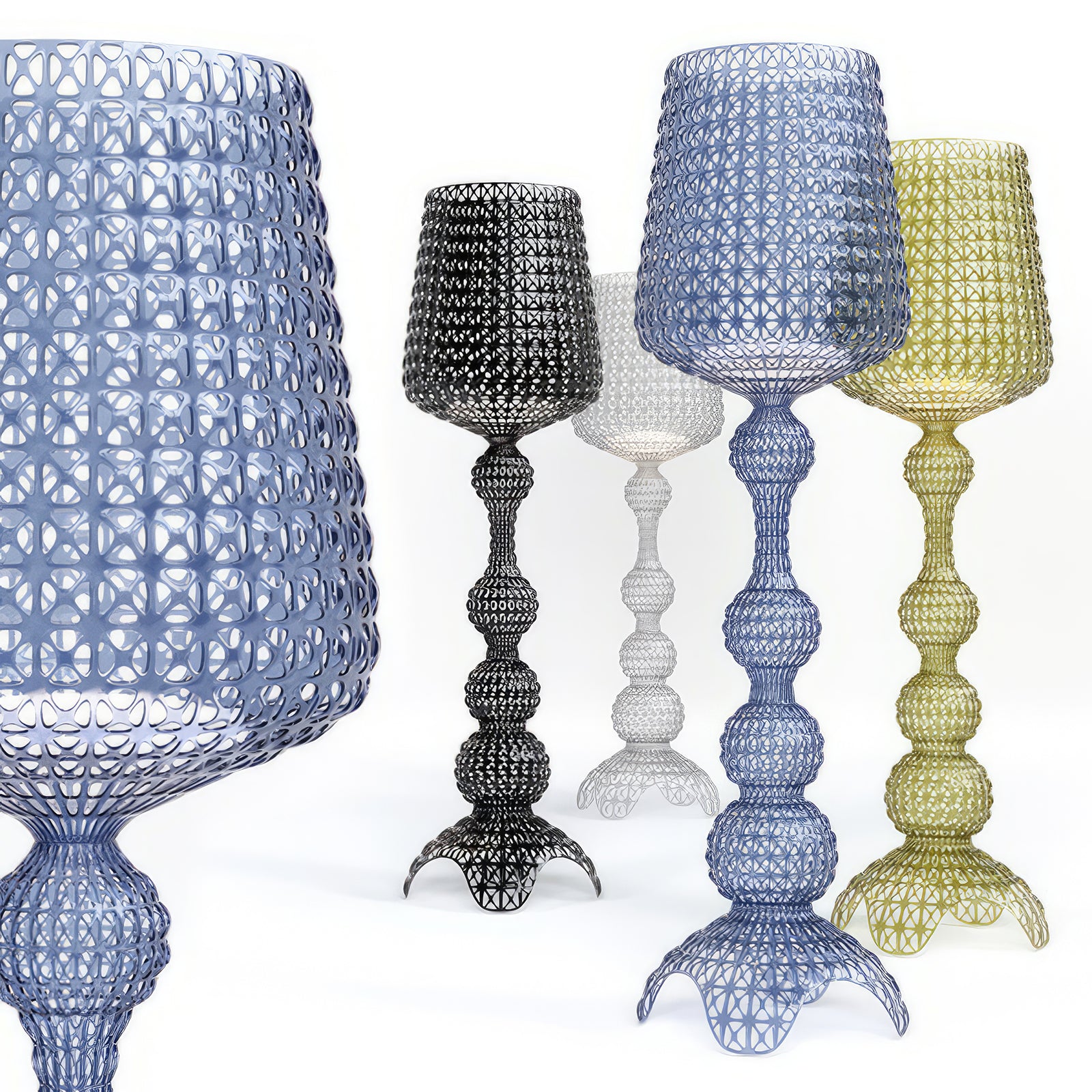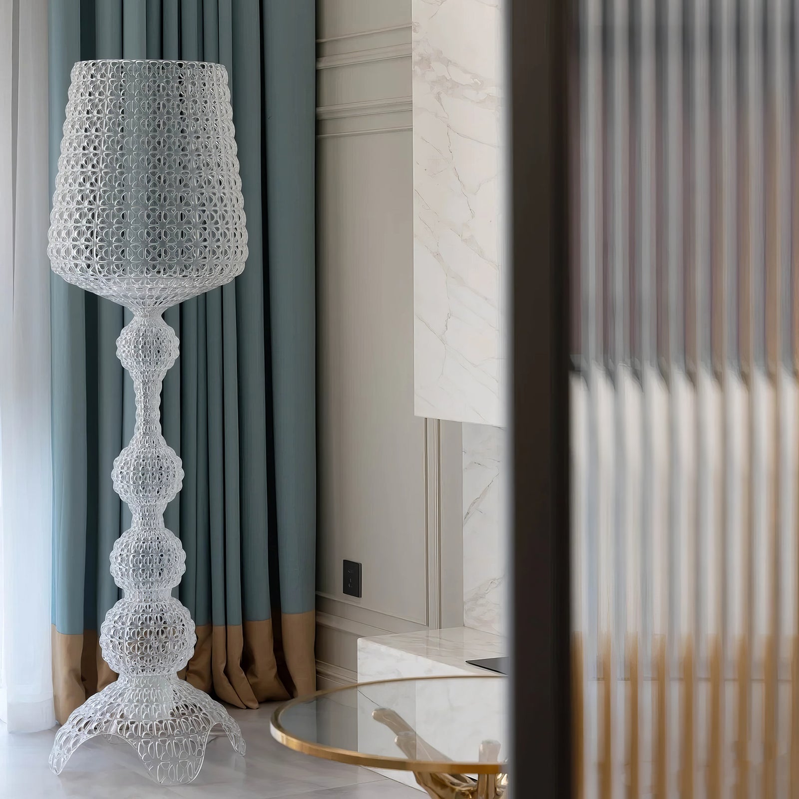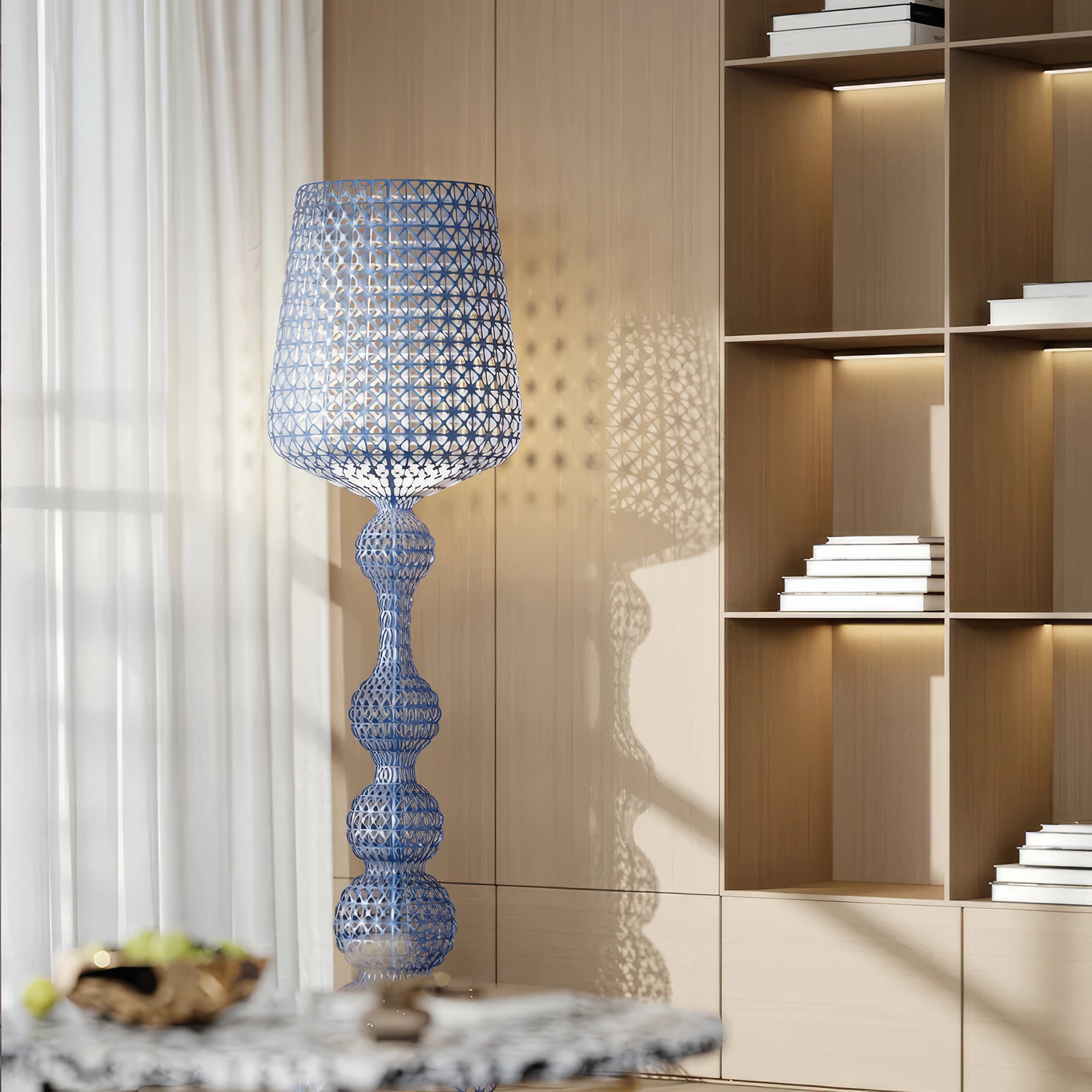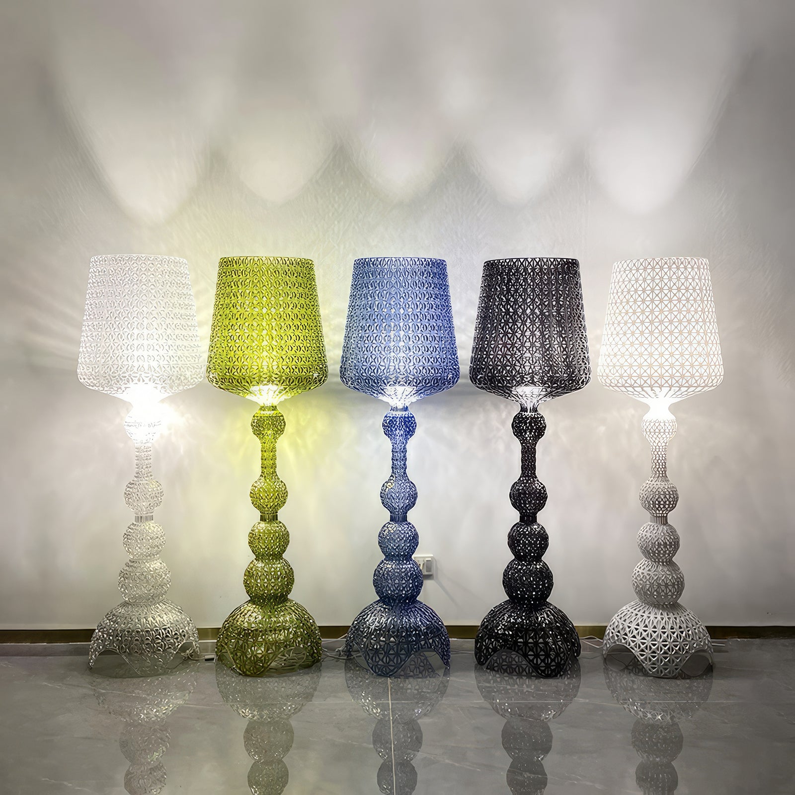 Illuminate your space with the stunning Kabuki Floor Lamp. Its delicate acrylic material and unique design in blue, clear, green, white, and black will seamlessly match your decor. Easy to install, it adds a beautiful ambiance to any room. Get your art and light fix in one with the Kabuki Floor Lamp!