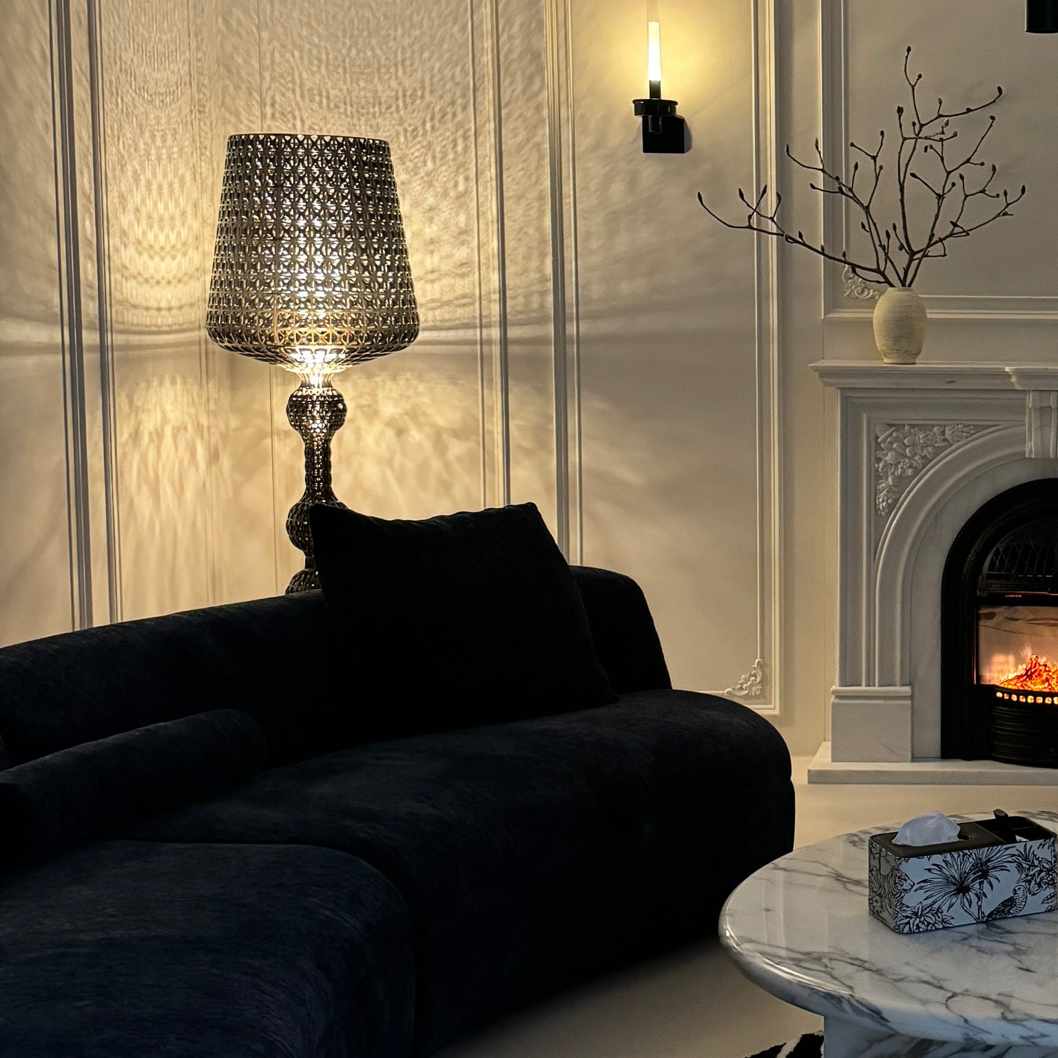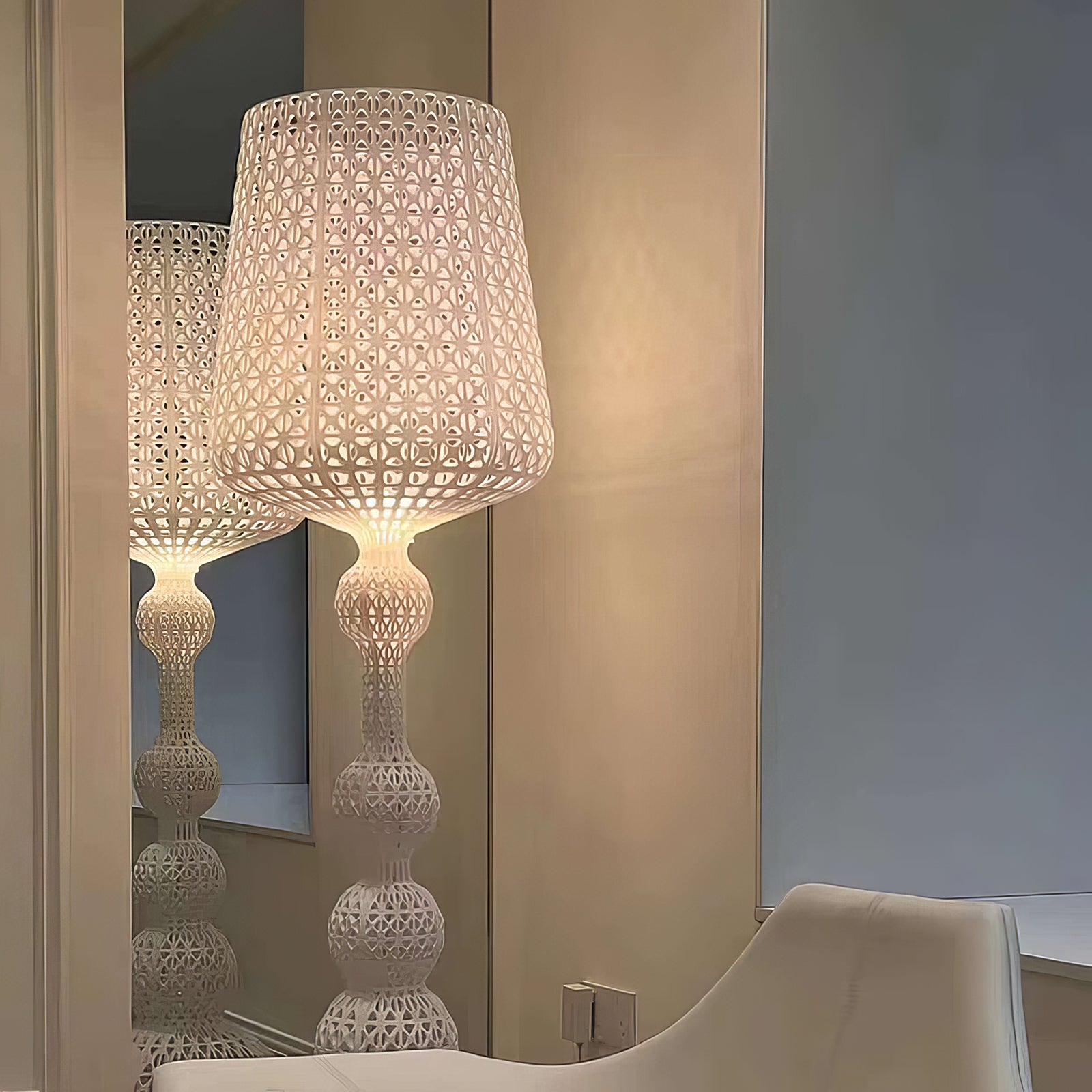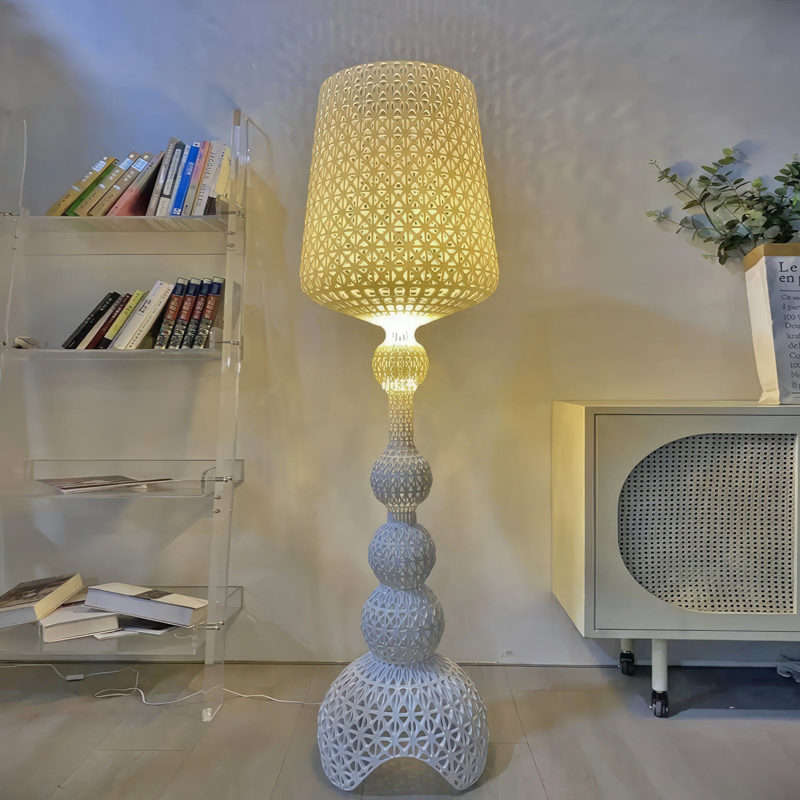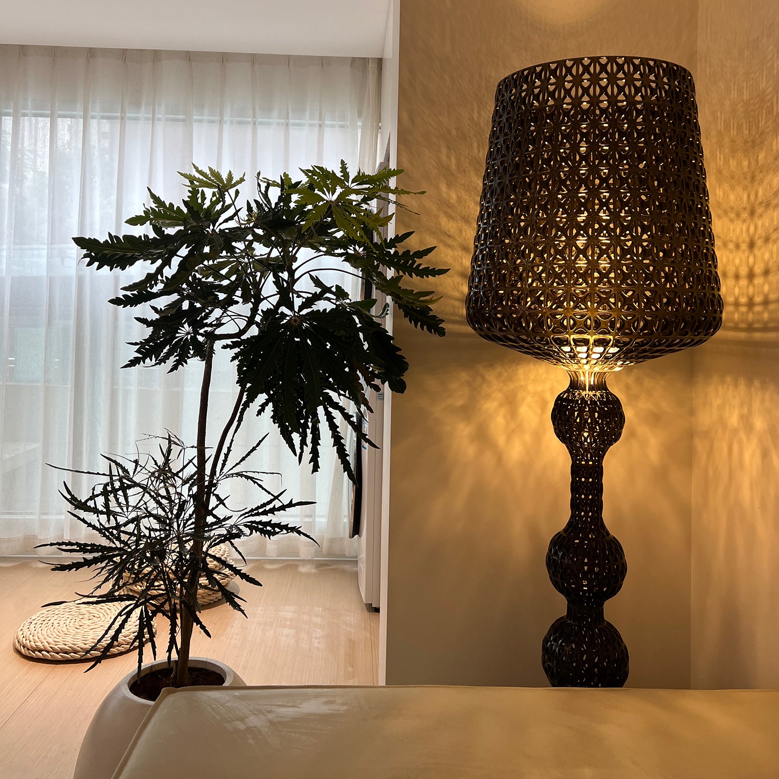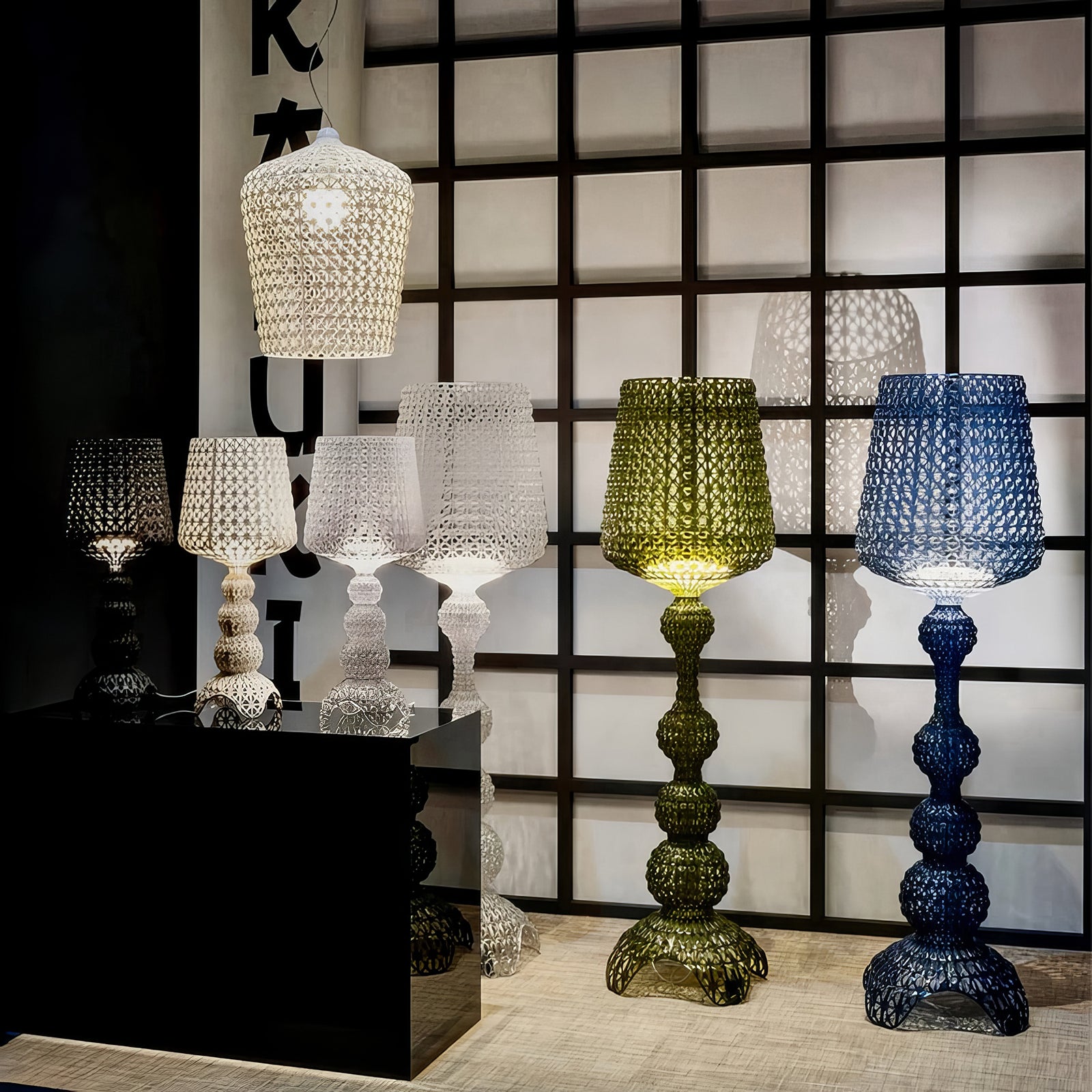 Illuminate your space with the stunning Kabuki Floor Lamp. Its delicate acrylic material and unique design in blue, clear, green, white, and black will seamlessly match your decor. Easy to install, it adds a beautiful ambiance to any room. Get your art and light fix in one with the Kabuki Floor Lamp!