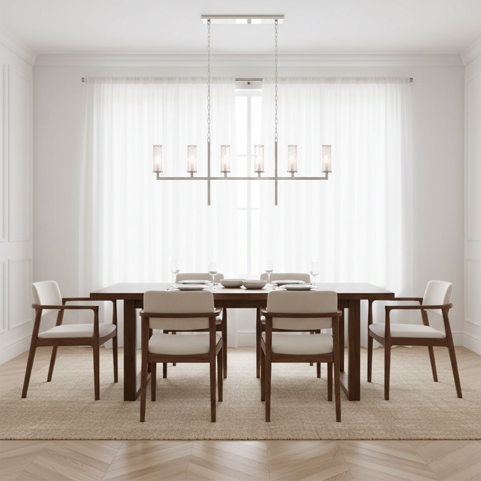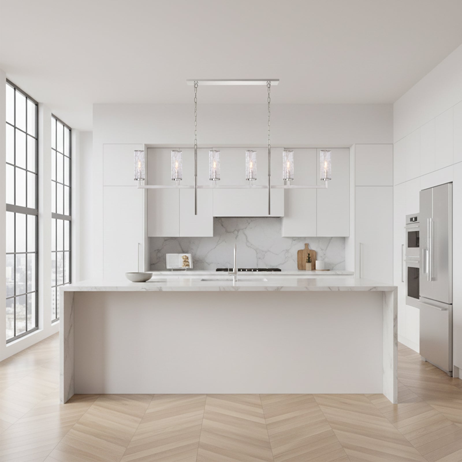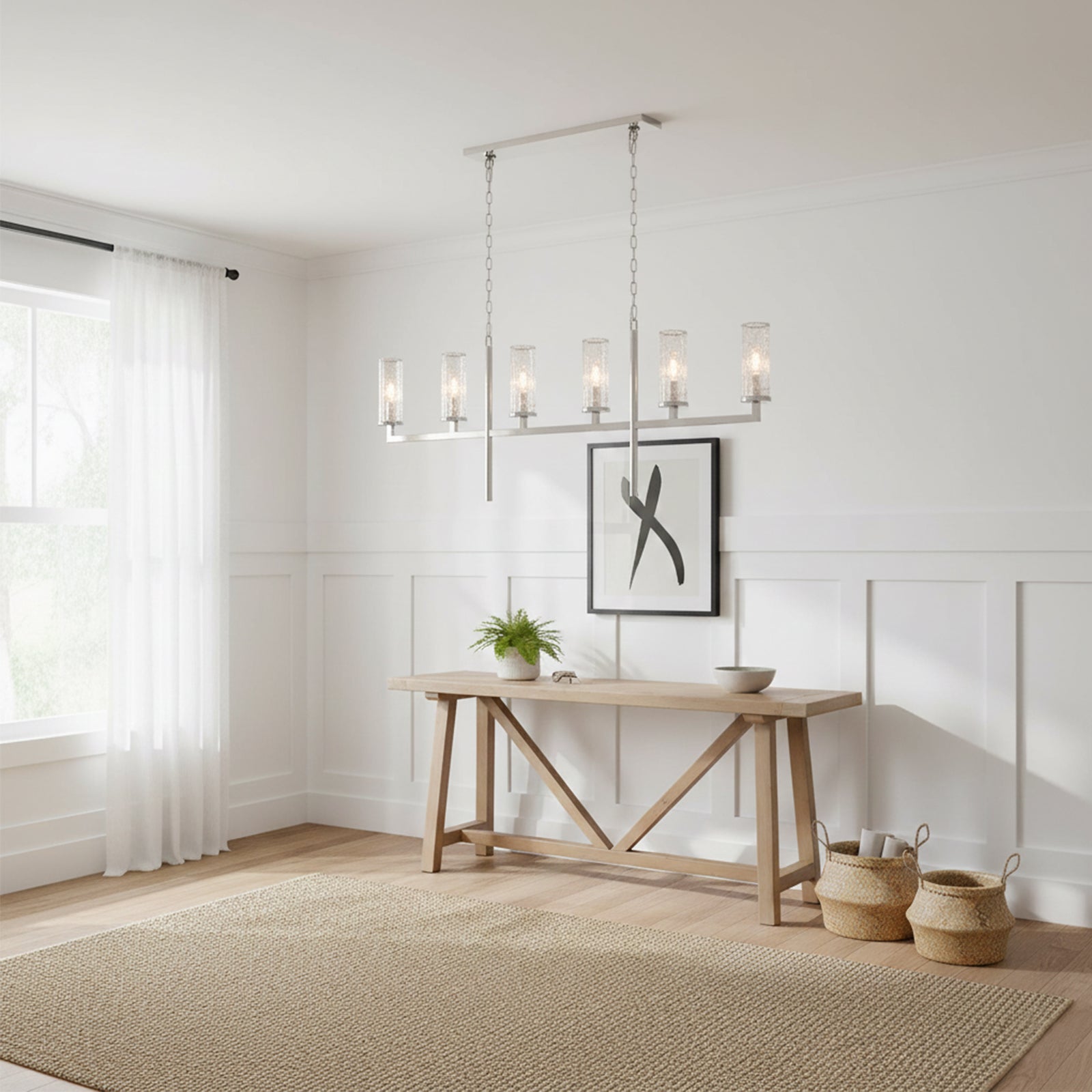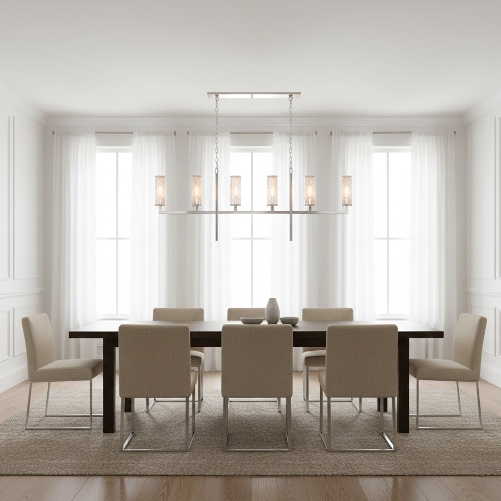 Elegantly enhance your space with the Large Linear Cracked Glass Chandelier. Its harmonious combination of metal and cracked glass shade reinterprets a classic silhouette with a modern twist. Featuring clean, architectural lines, this beautiful piece inspires and adds a touch of luxury to your setting.