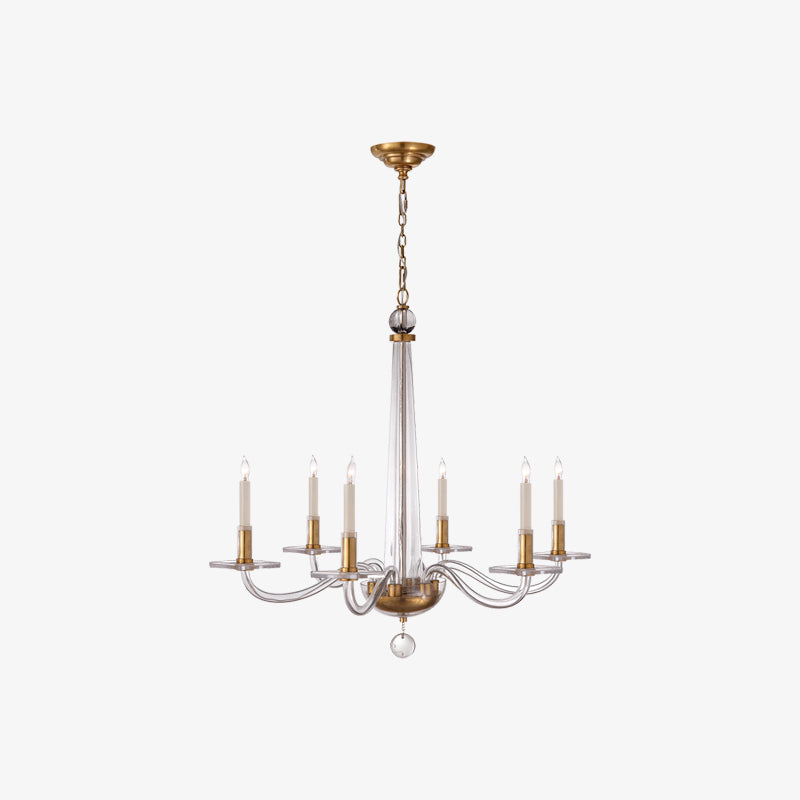 Elevate your space with the Medium Glass Chandelier. Its clear glass panels elegantly showcase the metal frame, creating a refined and polished look. Perfect for adding a touch of sophistication to any room while providing ample lighting.