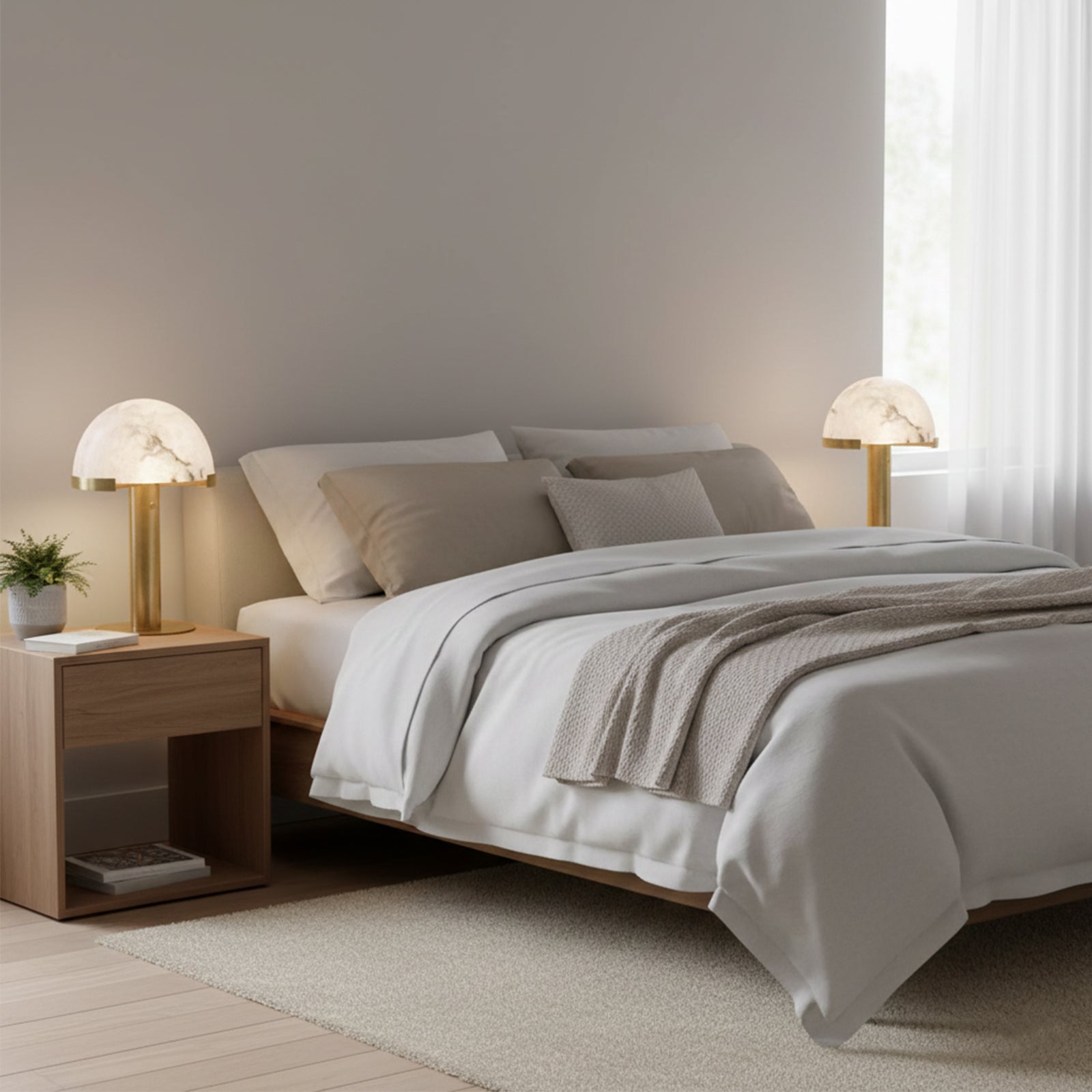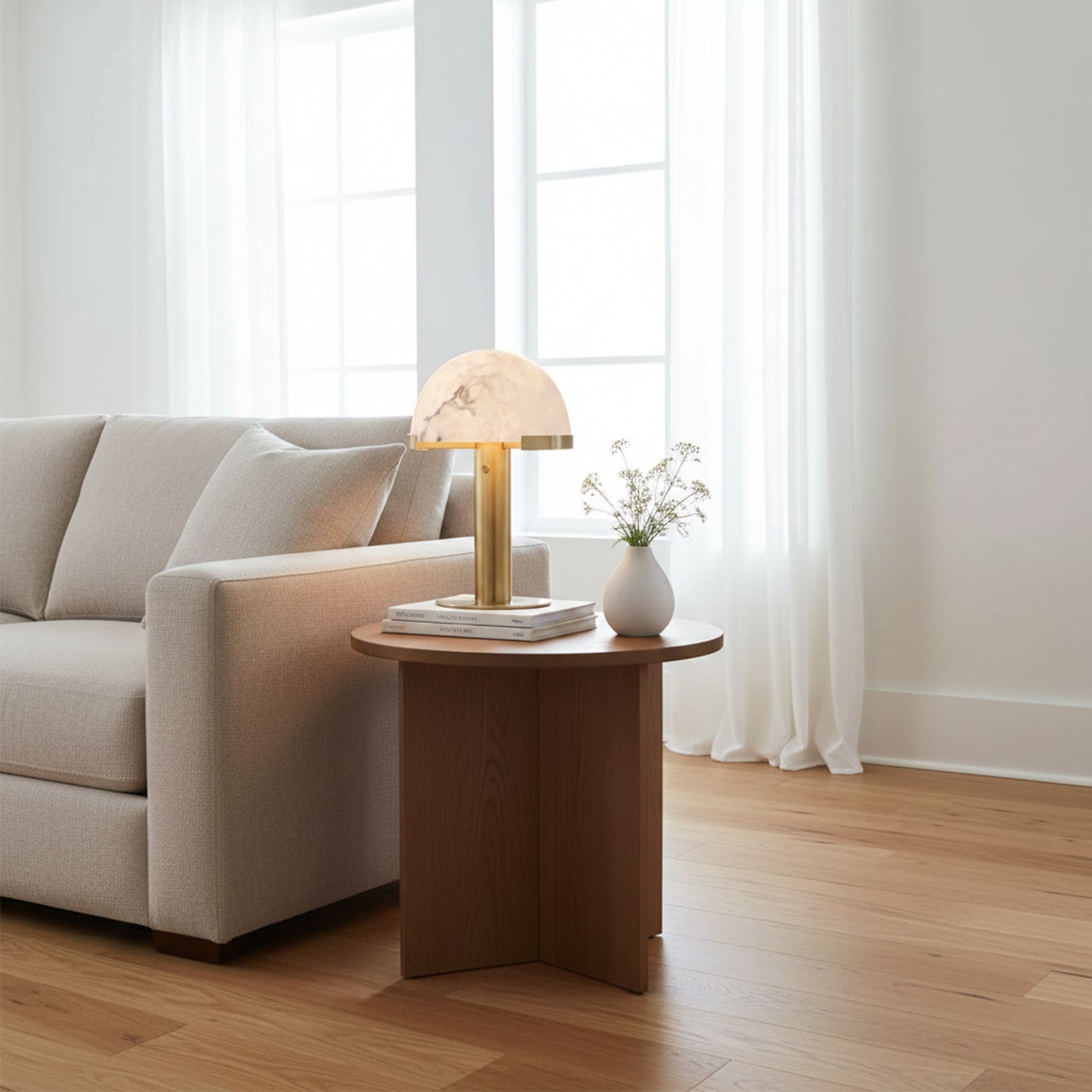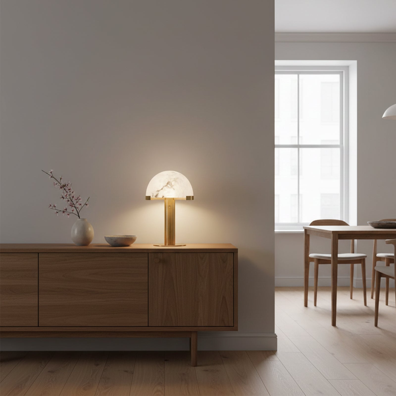 Experience modern luxury with the Modern Organic Stone and Brass Table Light. The unique combination of natural organic stone creates a striking contrast, adding an opulent element to any room. The sculpted shade emits a soft glow, while the streamlined shape softens sharp edges. Illuminate your space with style and sophistication.