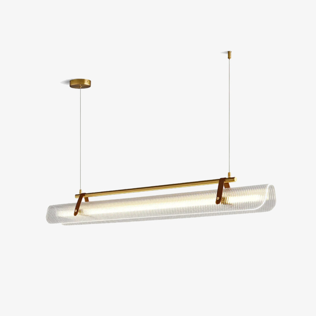 The piece appears both bold and light by pairing metal and acrylic. The outer metal structure gives the piece its sharp silhouette while the acrylic softens things up with its pleasant arch. This sense of refinement shows in the fine, near-disappearing quality of the wire suspension. The striations marking the acrylic present the LED light with a spacious and mellow quality. This long sweeping glow is ideal for the table setting.