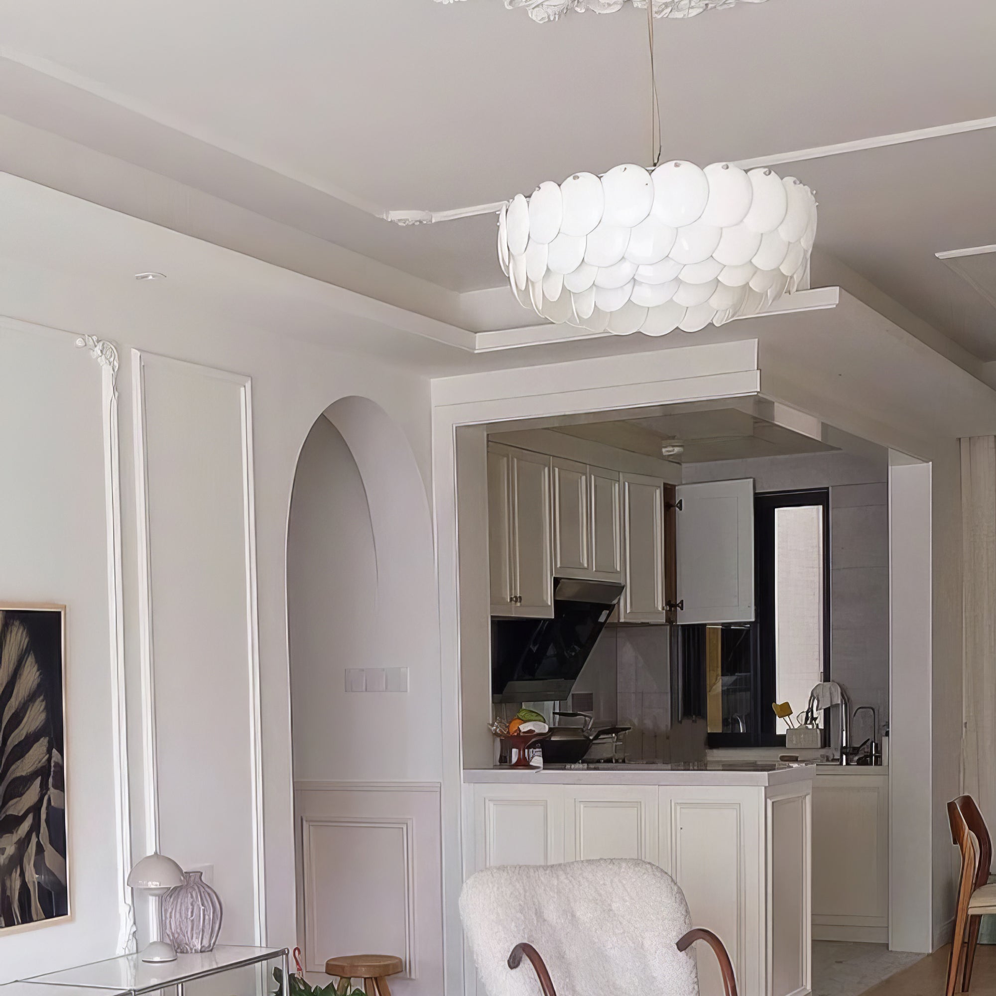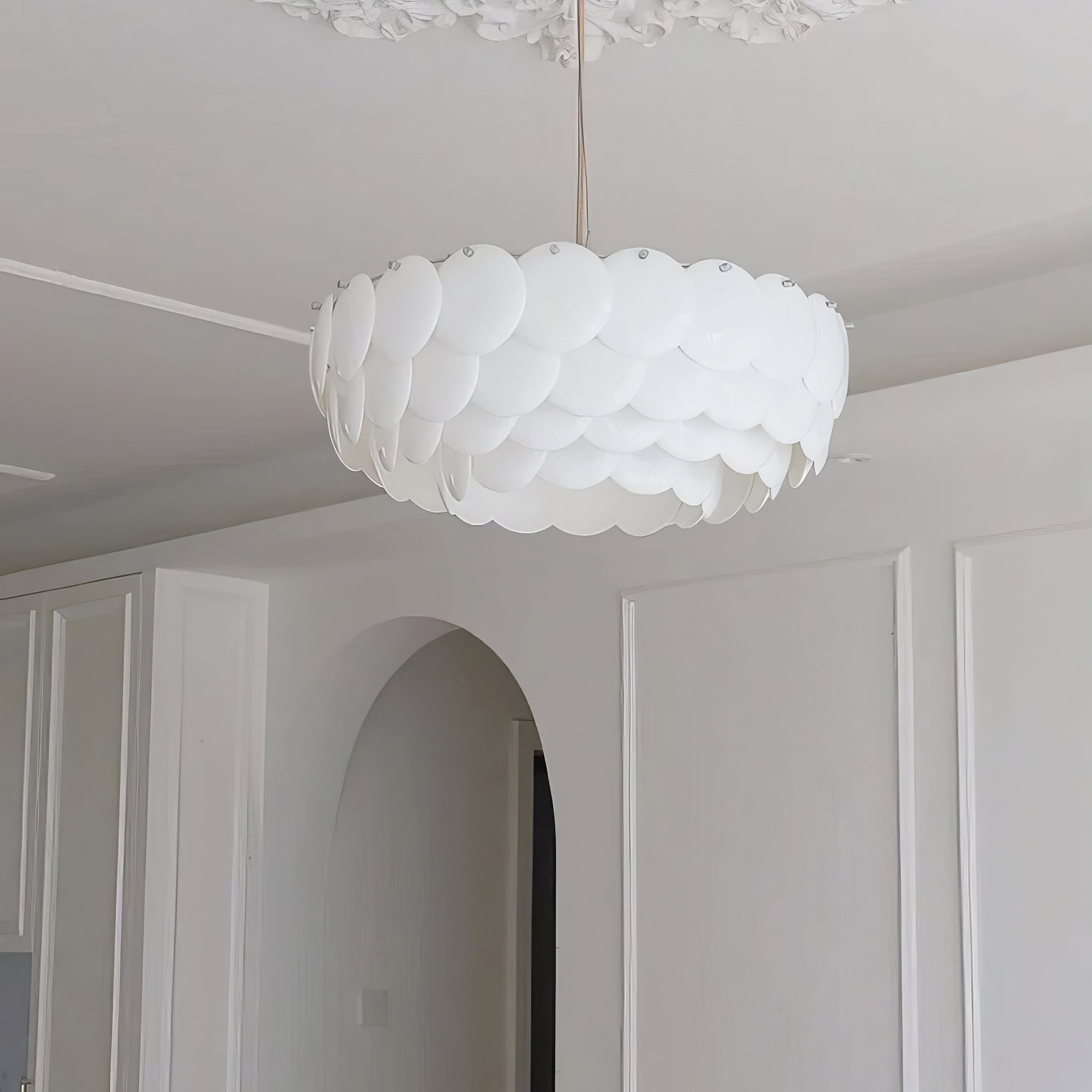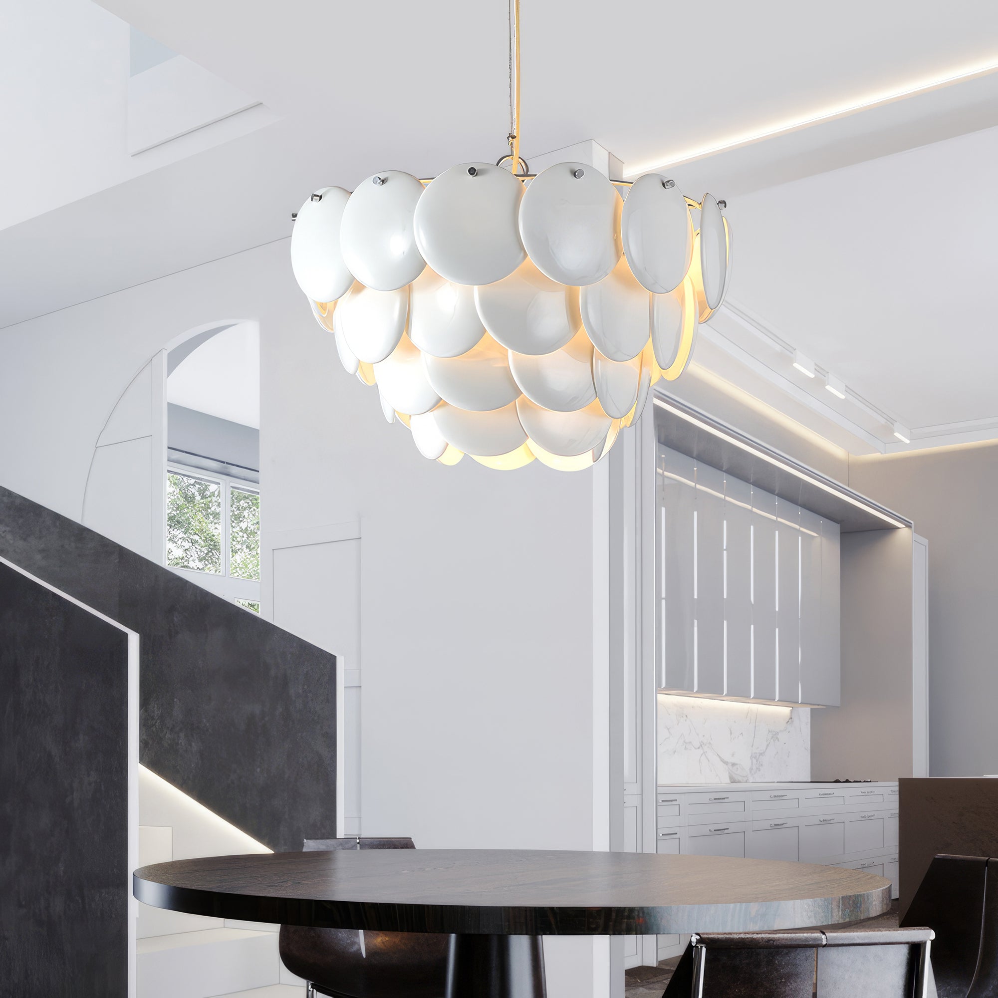 Experience soft, atmospheric lighting with our Pembridge Chandelier. Multiple layers of high-quality ceramic diffuse light to create a beautiful play of light and shadow. Open at the top and bottom, this chandelier adds a luxurious touch to any space. Elevate your home with the Pembridge Chandelier.