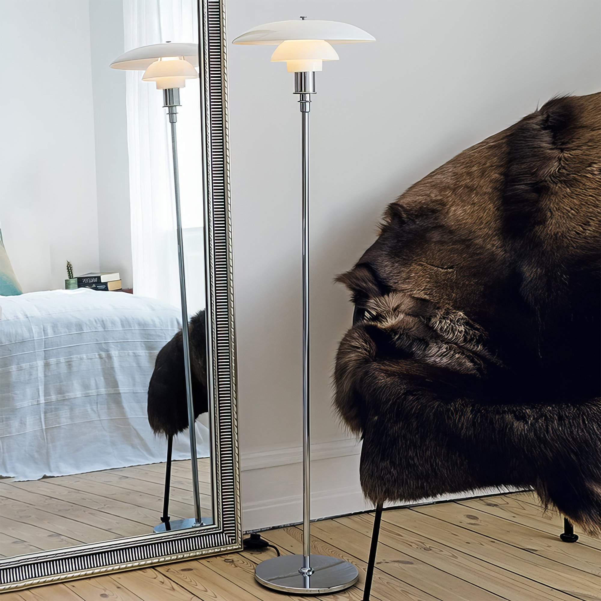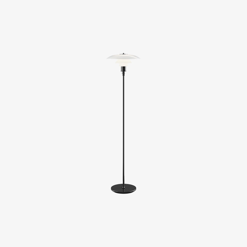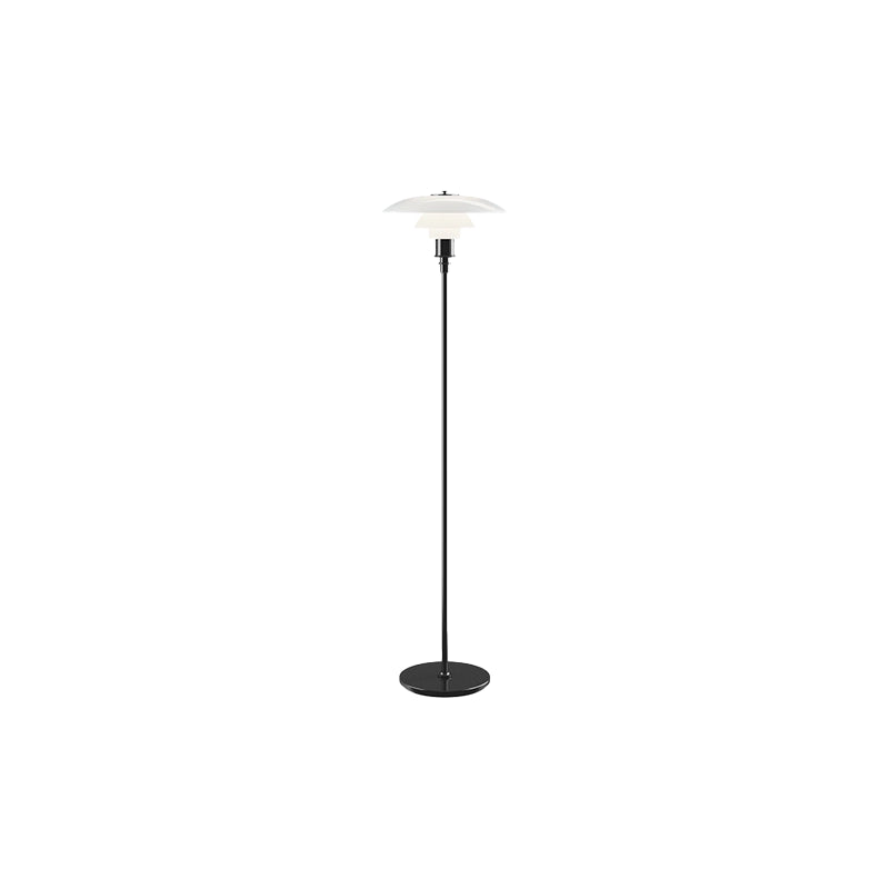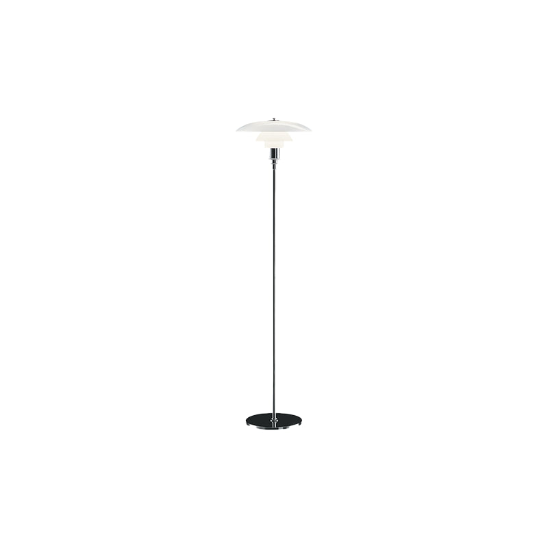 Illuminate your space with the elegant and functional Poulsen PH 3½-2½ Floor Lamp. Its 3-layered shade system directs light downwards, while the blown, milk-white glass shades offer a glossy front and matte back for a soft and diffused effect. Enjoy efficient and beautiful lighting with this lamp.