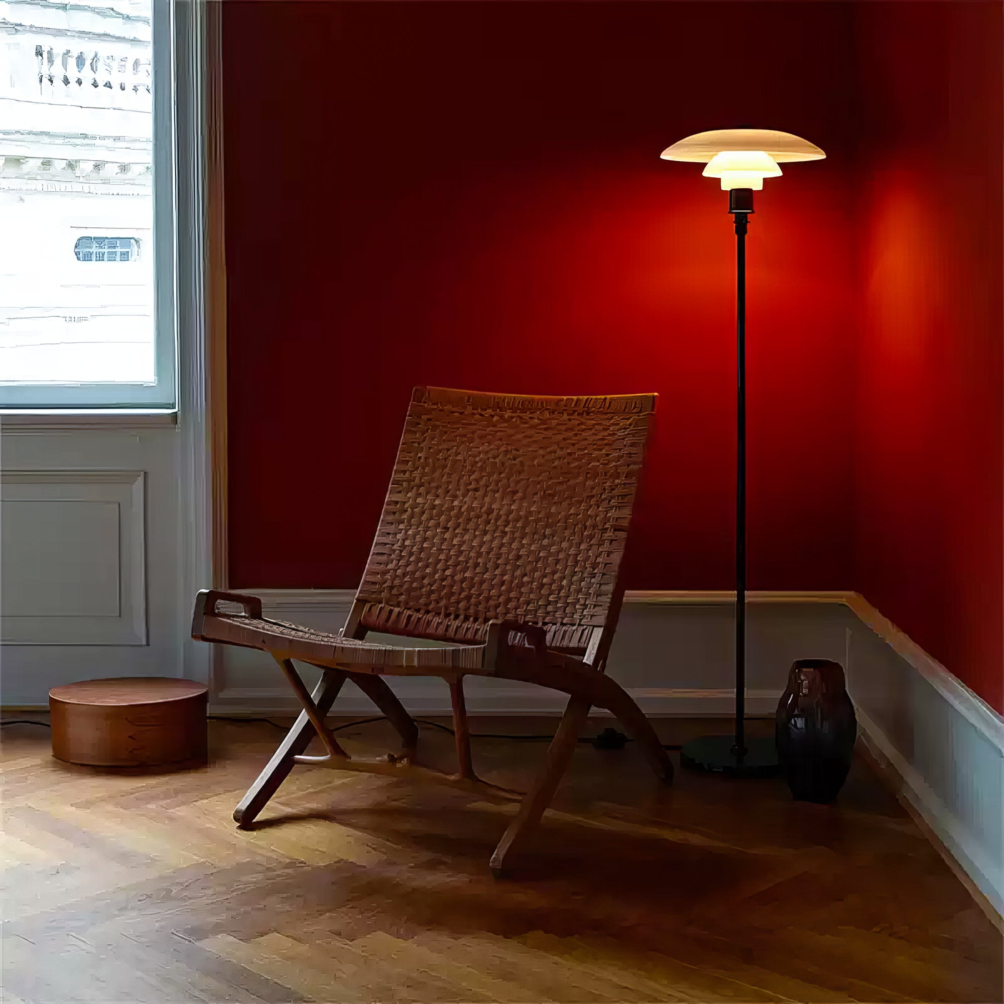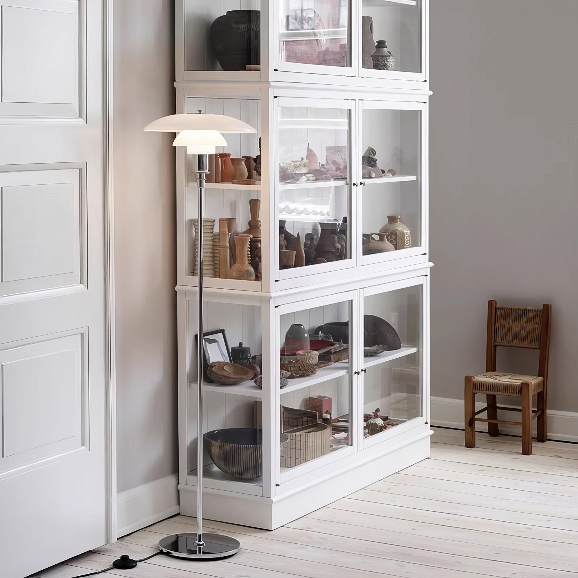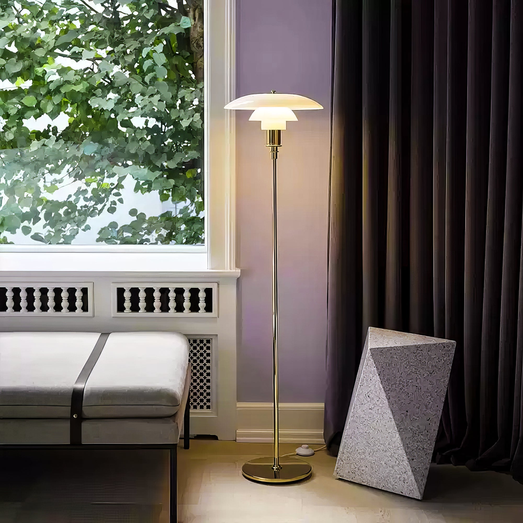 Illuminate your space with the elegant and functional Poulsen PH 3½-2½ Floor Lamp. Its 3-layered shade system directs light downwards, while the blown, milk-white glass shades offer a glossy front and matte back for a soft and diffused effect. Enjoy efficient and beautiful lighting with this lamp.