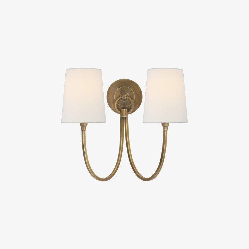 Elevate your space with the Reed Double Wall Sconce. Its elegant curved arms and tapered shade radiate sophistication and warmth. The soft, inviting light from the linen shade adds a cozy ambiance, perfect for dining or relaxing by the fireplace. Bring style and charm to any room with this beautiful lamp.