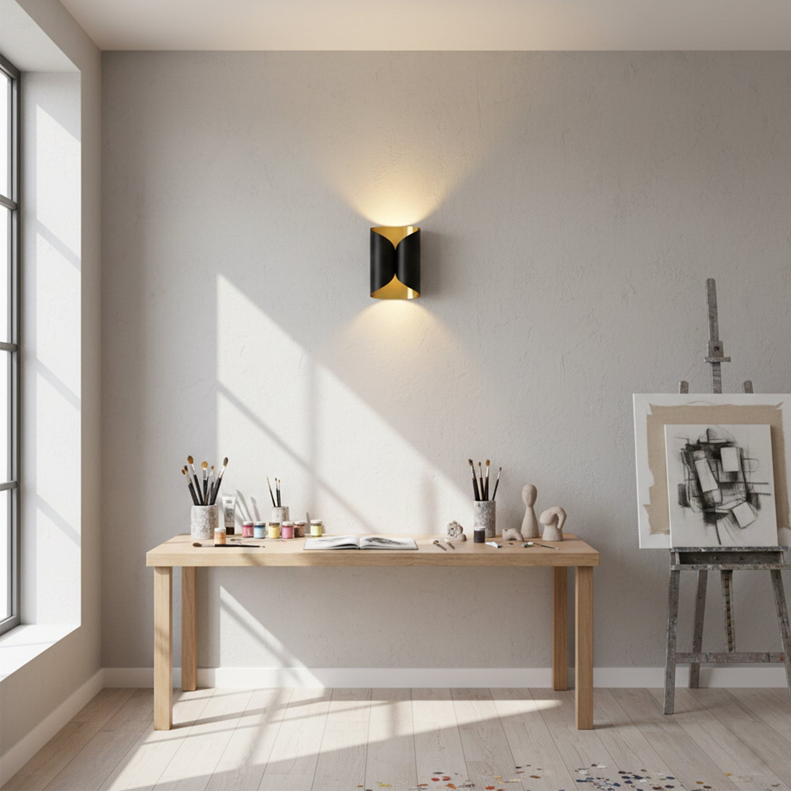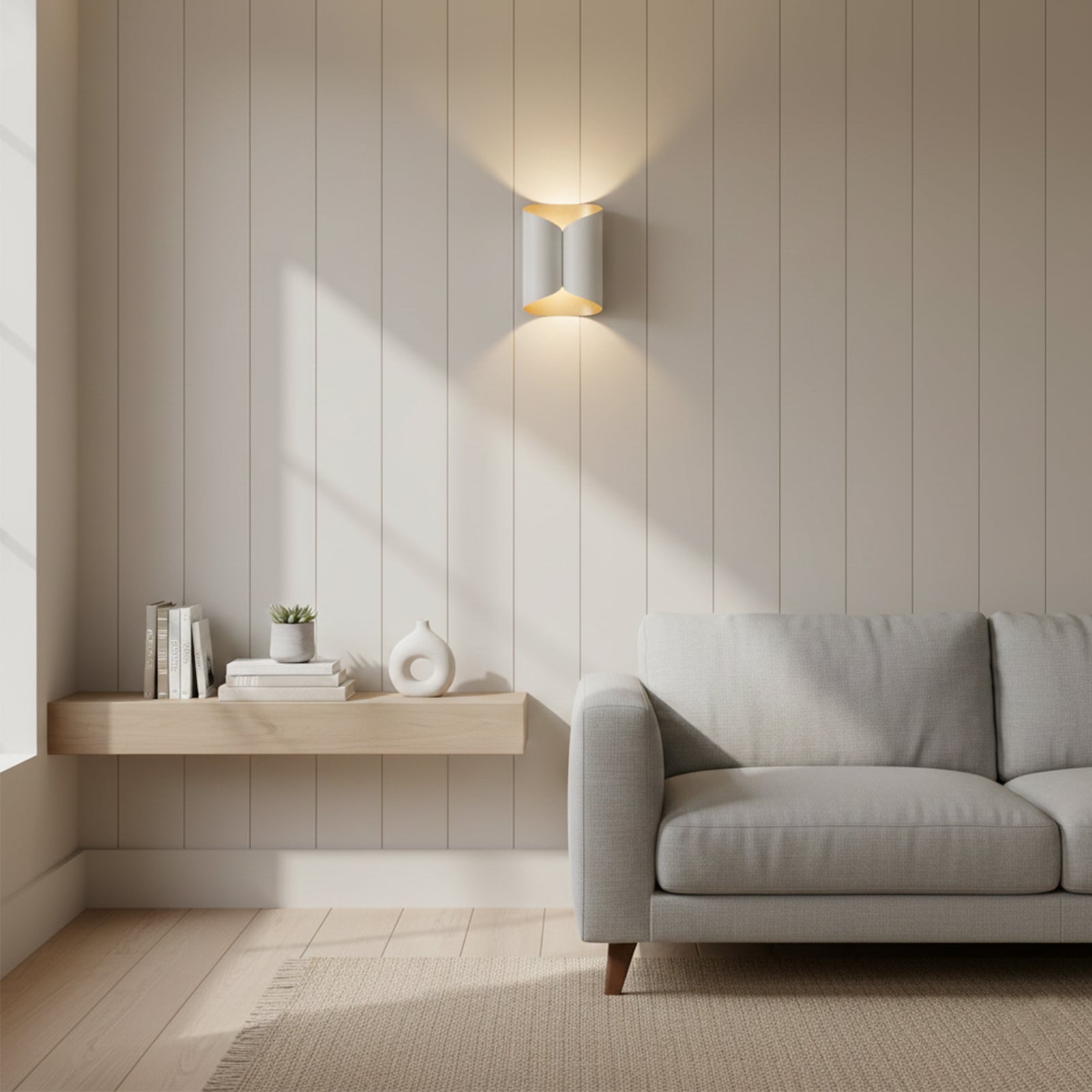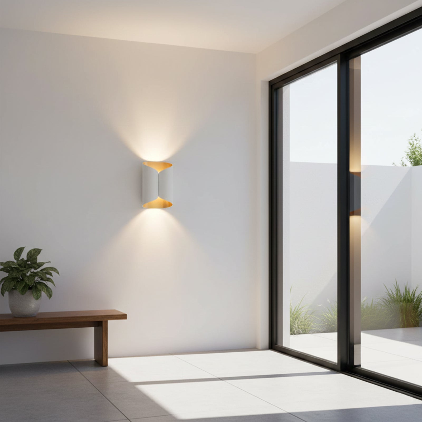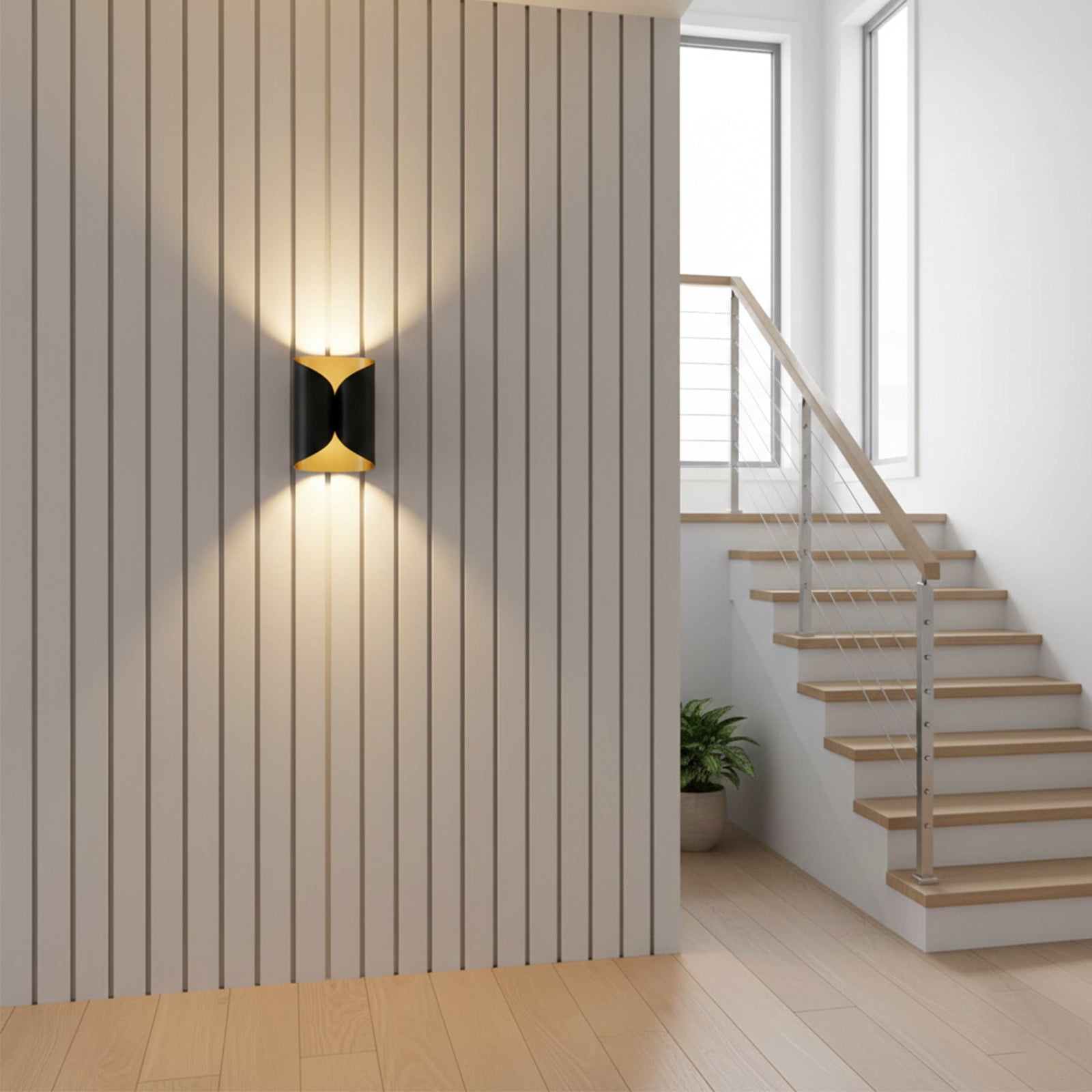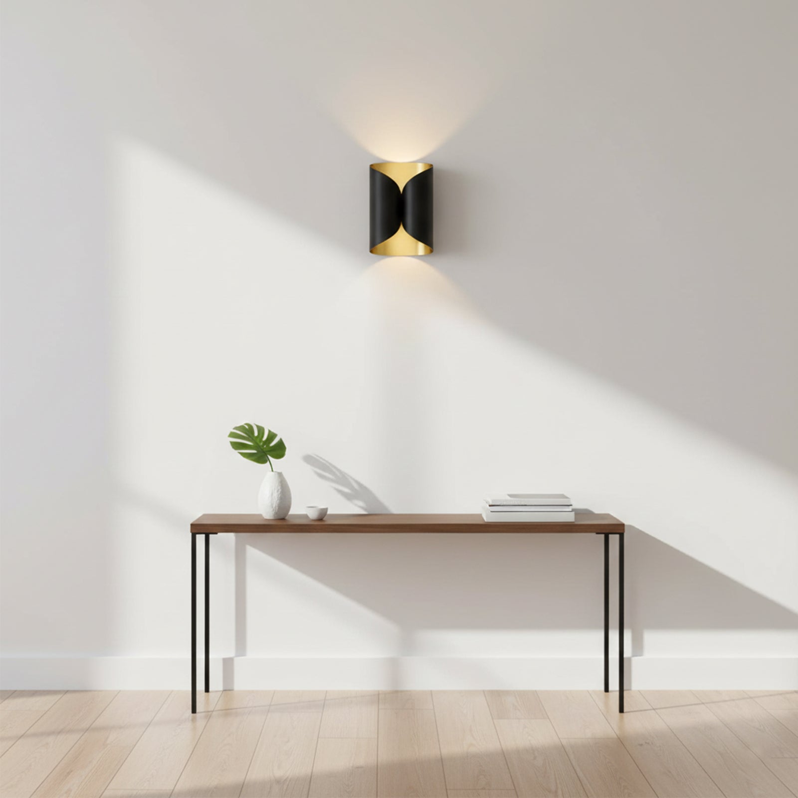 Illuminate your home with the Cylinder Up-and-Down Wall Light. Its beautiful finish and sleek design are inspired by sculptural forms, making it suitable for both modern and traditional interiors. The light source reflects off a striking gold interior, which adds a warm glow to the illumination, creating a welcoming ambiance. A must-have piece for elevating any space.