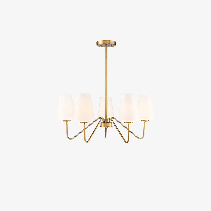 Drawing inspiration from mid-century design, this simple brass five-head chandelier is the perfect addition to any space. Its elegant tapered white glass shade provides bright, even lighting, creating a warm, inviting ambiance. It allows you to adjust the brightness to your specific needs. Made from high-quality metal with a natural brass finish, it is durable and built to withstand harsh environments, providing long life and reliability.