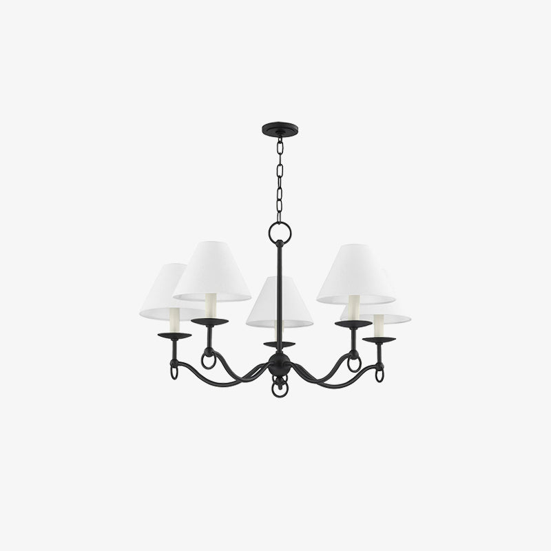 The Troy Lighting Massi Five-Arm Chandelier seamlessly blends timeless elegance with a transitional twist. Its classic English-style shades and candelabra lighting are complemented by finely crafted details, such as looped hardware and a central accent sphere, merging traditional sophistication with a modern edge. The chandelier’s gracefully curved arms add an extra touch of refinement, while the forged iron finish and white linen shades create a retro-chic aesthetic. Perfect for settings from traditional to modern farmhouse, this versatile piece brings warmth, charm, and a sense of understated luxury to any room.