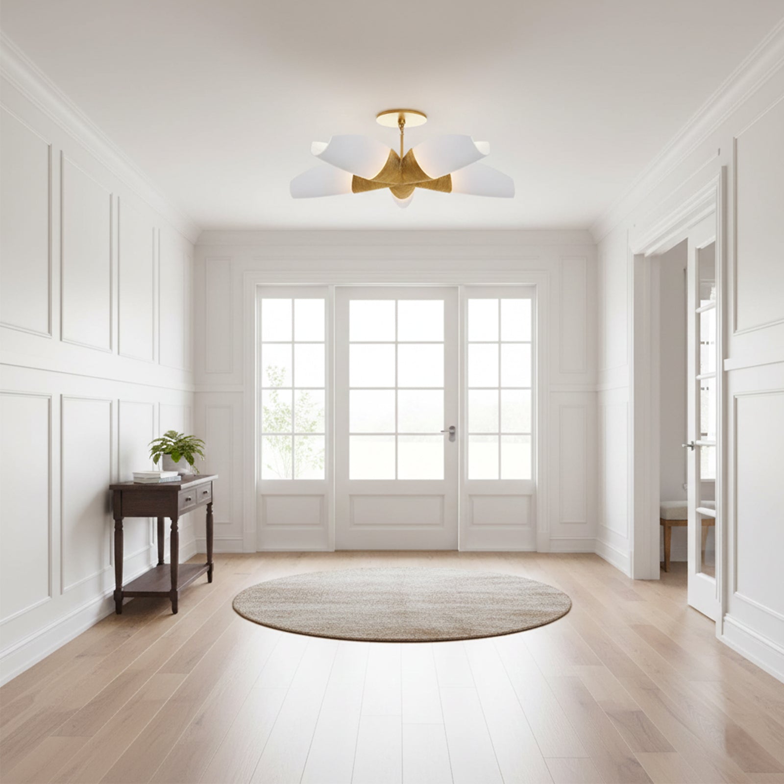 This stunning chandelier features a gilded finish and a unique ribbed texture. Five elongated glass molds are arranged in a captivating fan-shaped pattern, adding a touch of elegance and sculptural artistry to any space. This one-of-a-kind piece is designed to be a luxurious focal point in your home.
