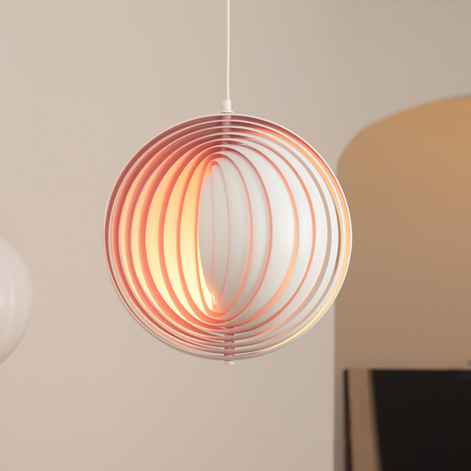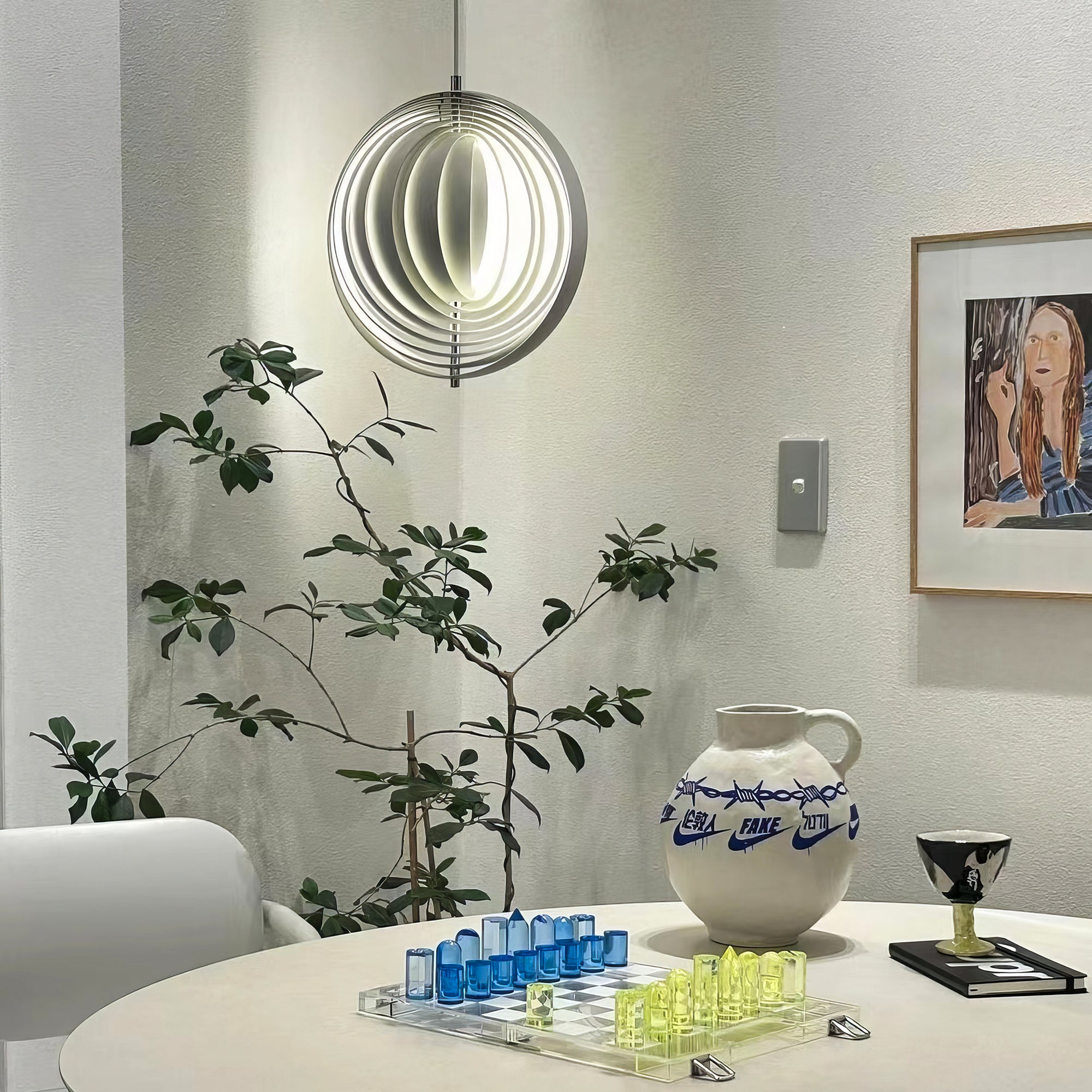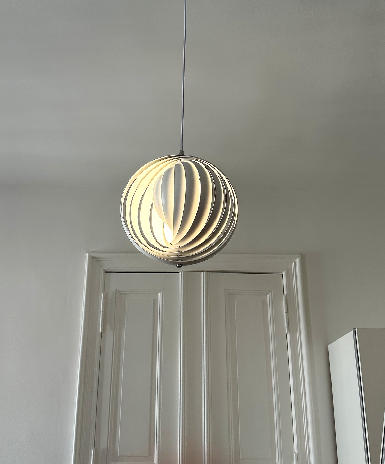 Experience the captivating and soft glow of the Verpan Moon Pendant Lamp. Its 10 rotating white porcelain metal blades gracefully surround the central bulb, creating a stunning and soft light. A classic design that radiates a beautiful glow. Elevate your space with this charming piece.