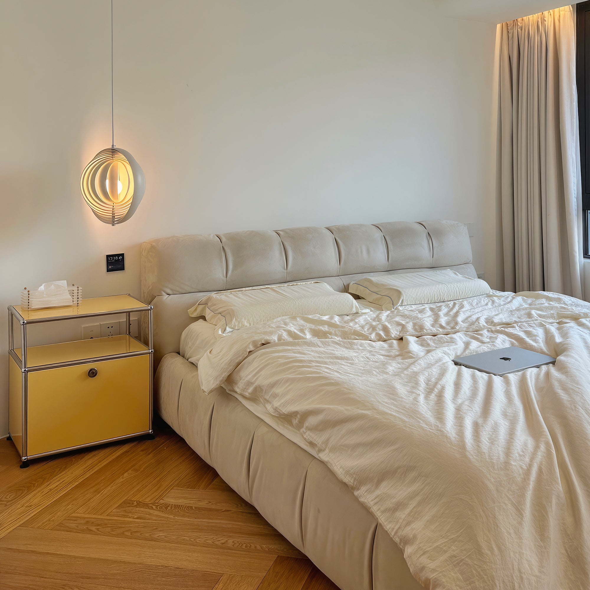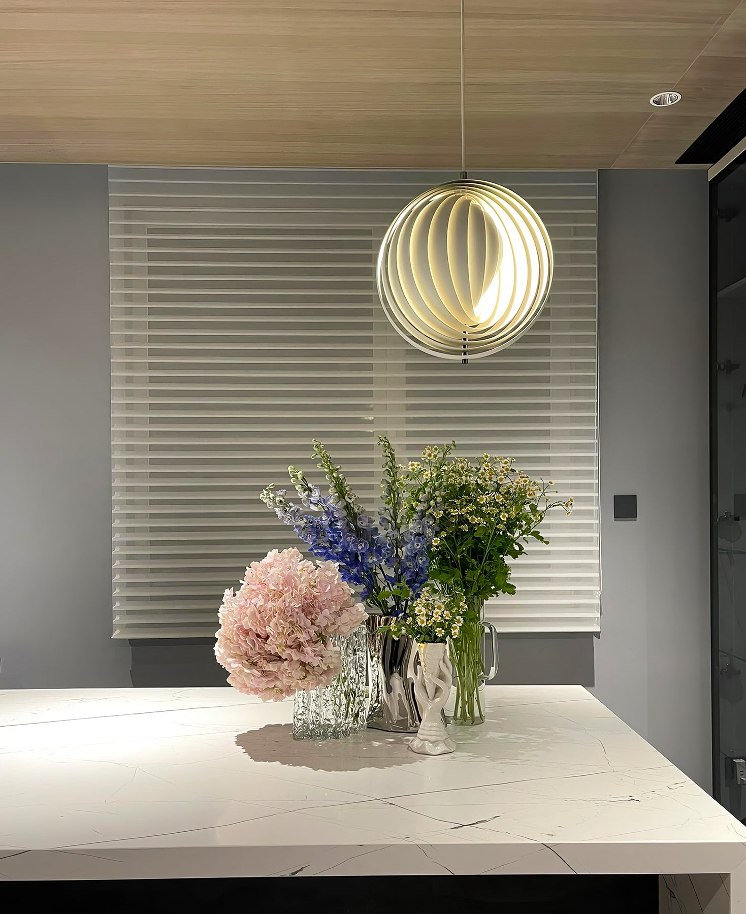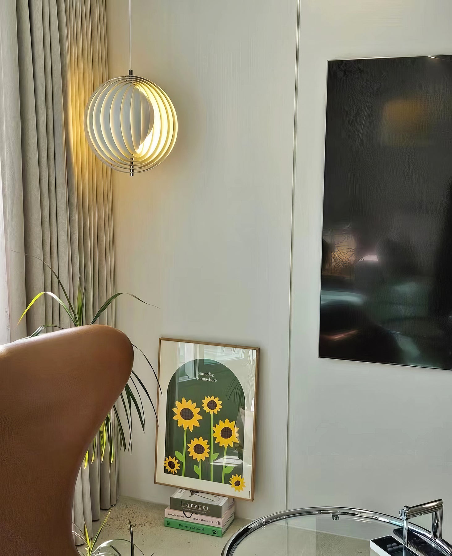 Experience the captivating and soft glow of the Verpan Moon Pendant Lamp. Its 10 rotating white porcelain metal blades gracefully surround the central bulb, creating a stunning and soft light. A classic design that radiates a beautiful glow. Elevate your space with this charming piece.