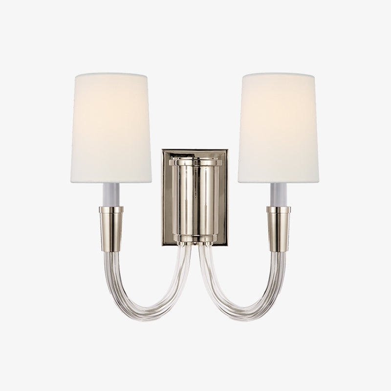 Add a touch of luxury and warmth to your walls with the Vivian Double Wall Sconce. The curved arm design and metallic finish create a subtle shimmer, while the warm glow of the shade adds a cozy ambiance to any room. Elevate your space with this beautiful yet simple lamp.