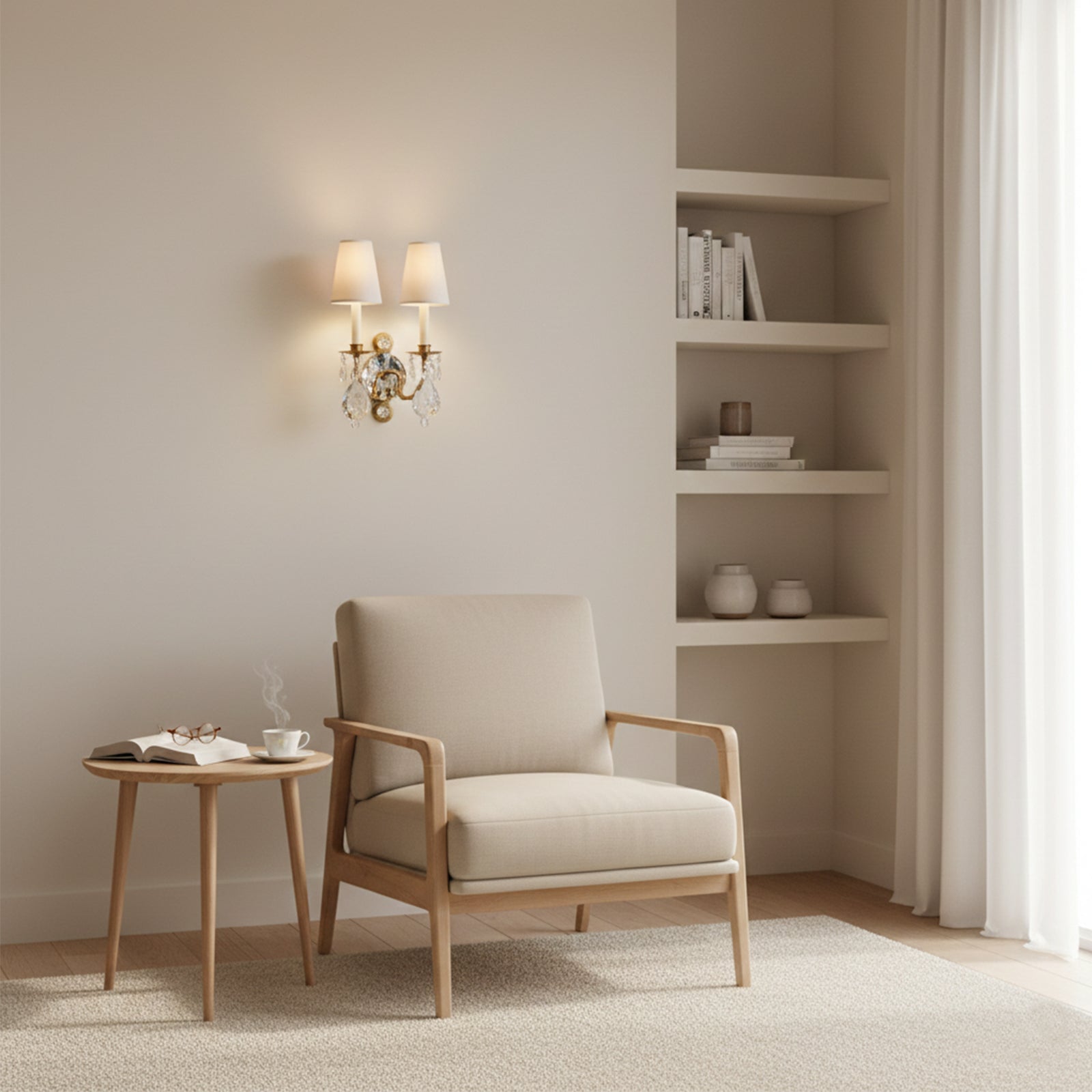 Crafted with gilded iron and adorned with crystal pendants, this lamp also features a delicate backplate and arm. Complete with a natural cotton lampshade, it adds a touch of luxury and sophistication to any room.